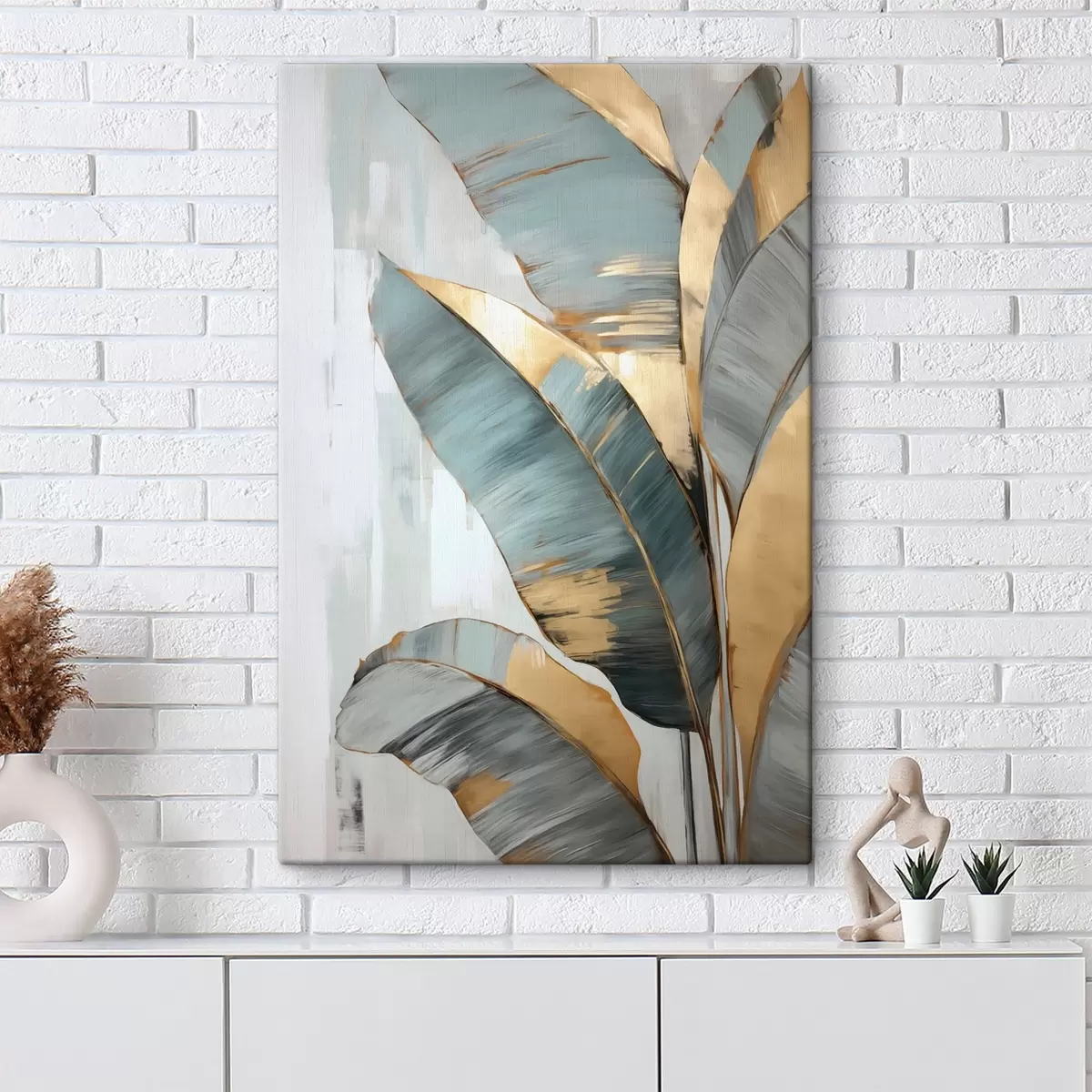 Obraz Súbor tlmených modrých, sivých a žltých banánových listov s viditeľnými ťahmi štetca na bielom abstraktnom pozadí Nr. s45551