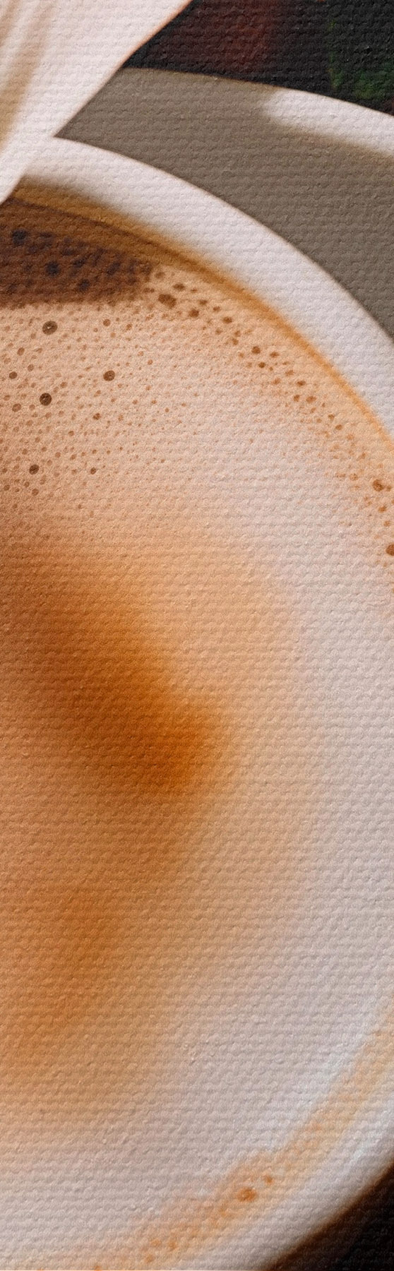 Obraz Šálka kávy s penou na bielom tanieri, kvety v pozadí, slnečné svetlo Nr. s45569