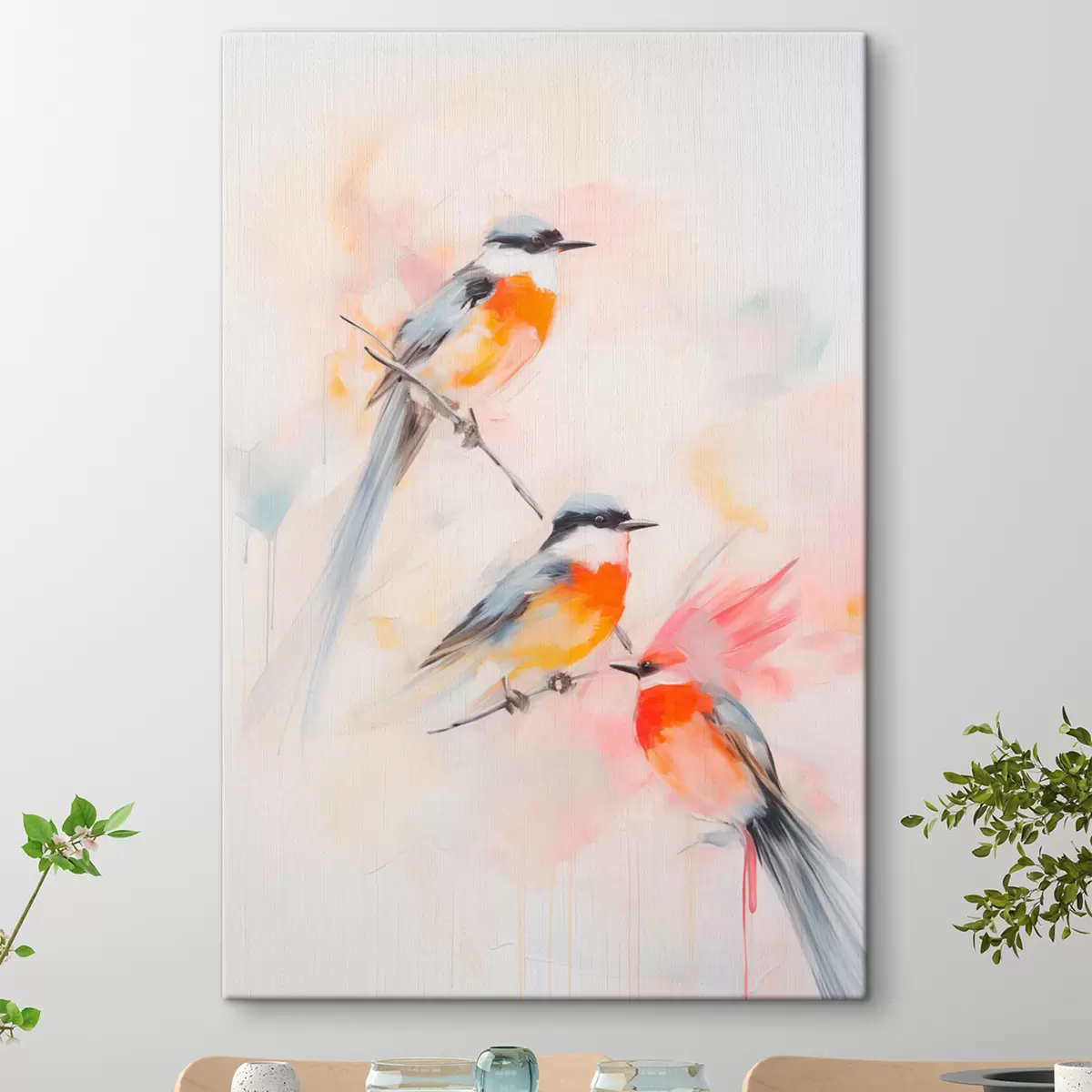 Obraz Vtáky sediace na konároch , jemné pastelové farby, svetlé pozadie s ružovými a bielymi odtieňmi Nr. s45577
