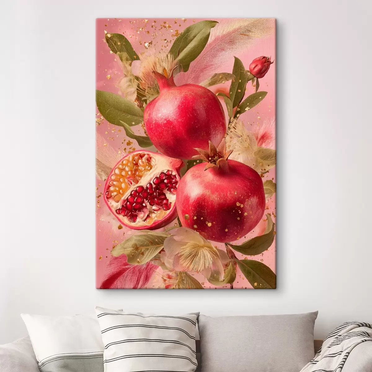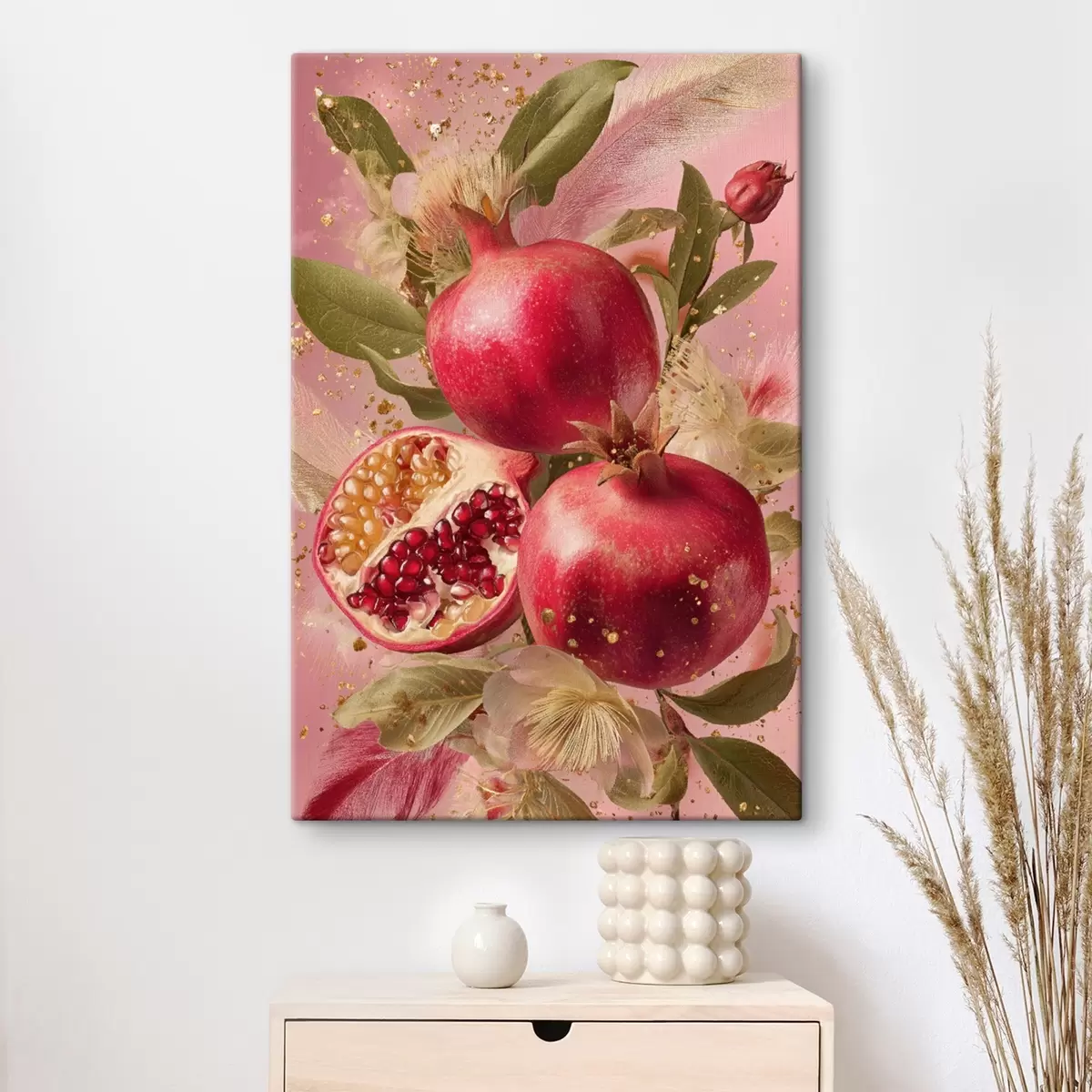 Obraz Zrelé granátové jablká na ružovom pozadí s lístím a zlatými škvrnami Nr. s45868