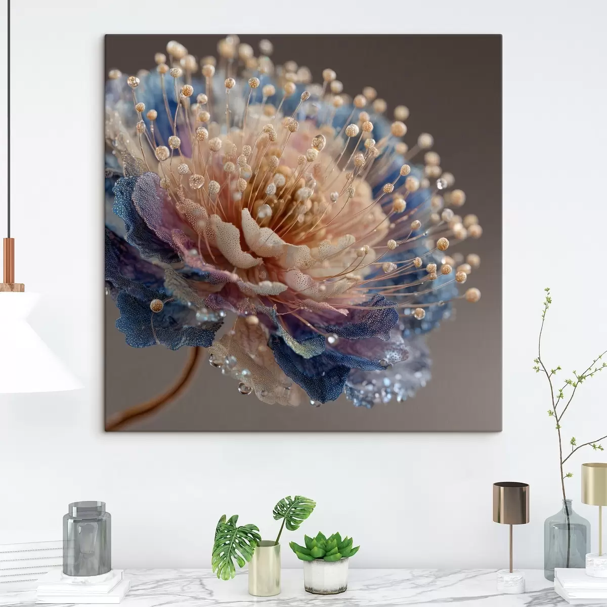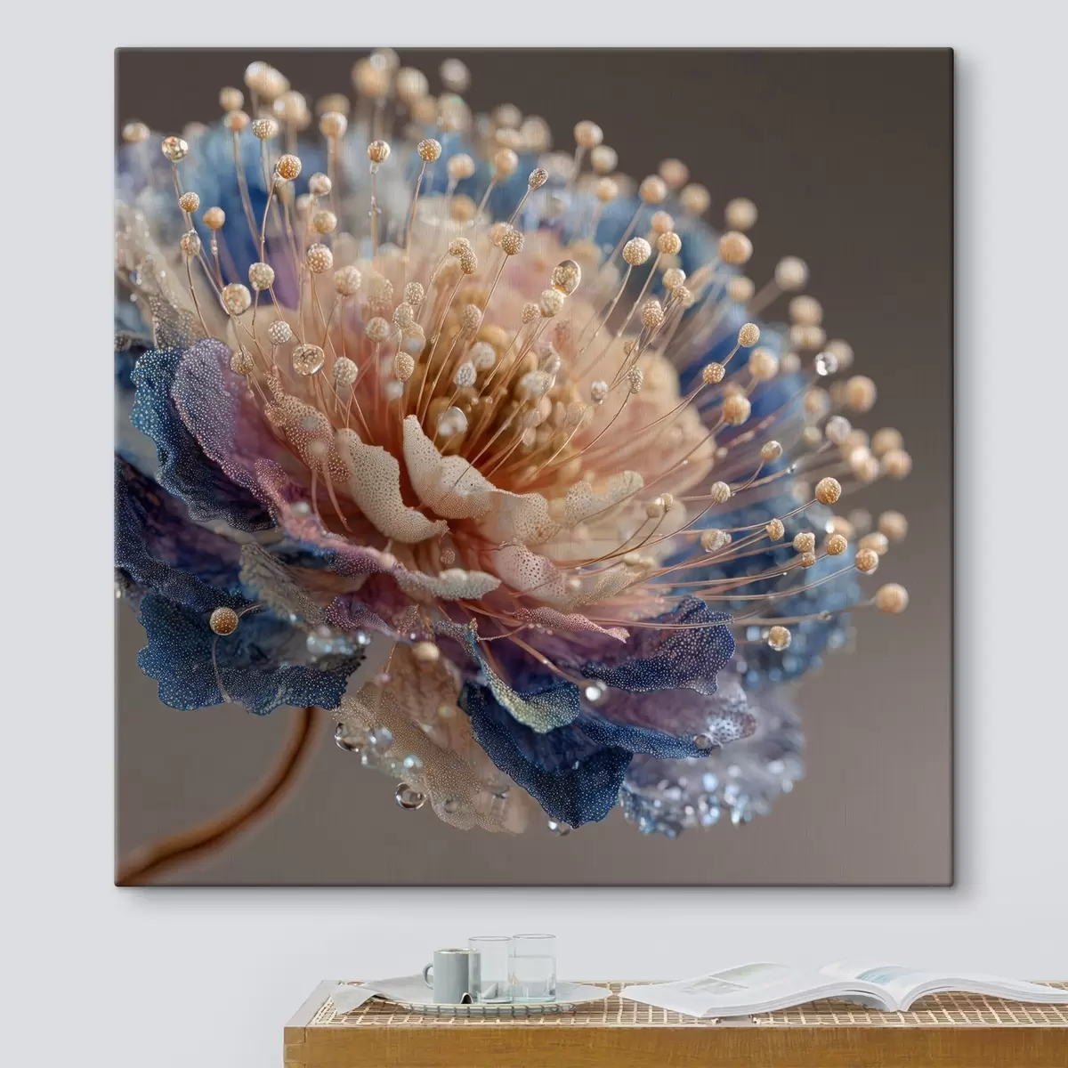 Obraz Perleťový kvet s kvapkami rosy, broskyňovo-modrými okvetnými lístkami Nr. s45911
