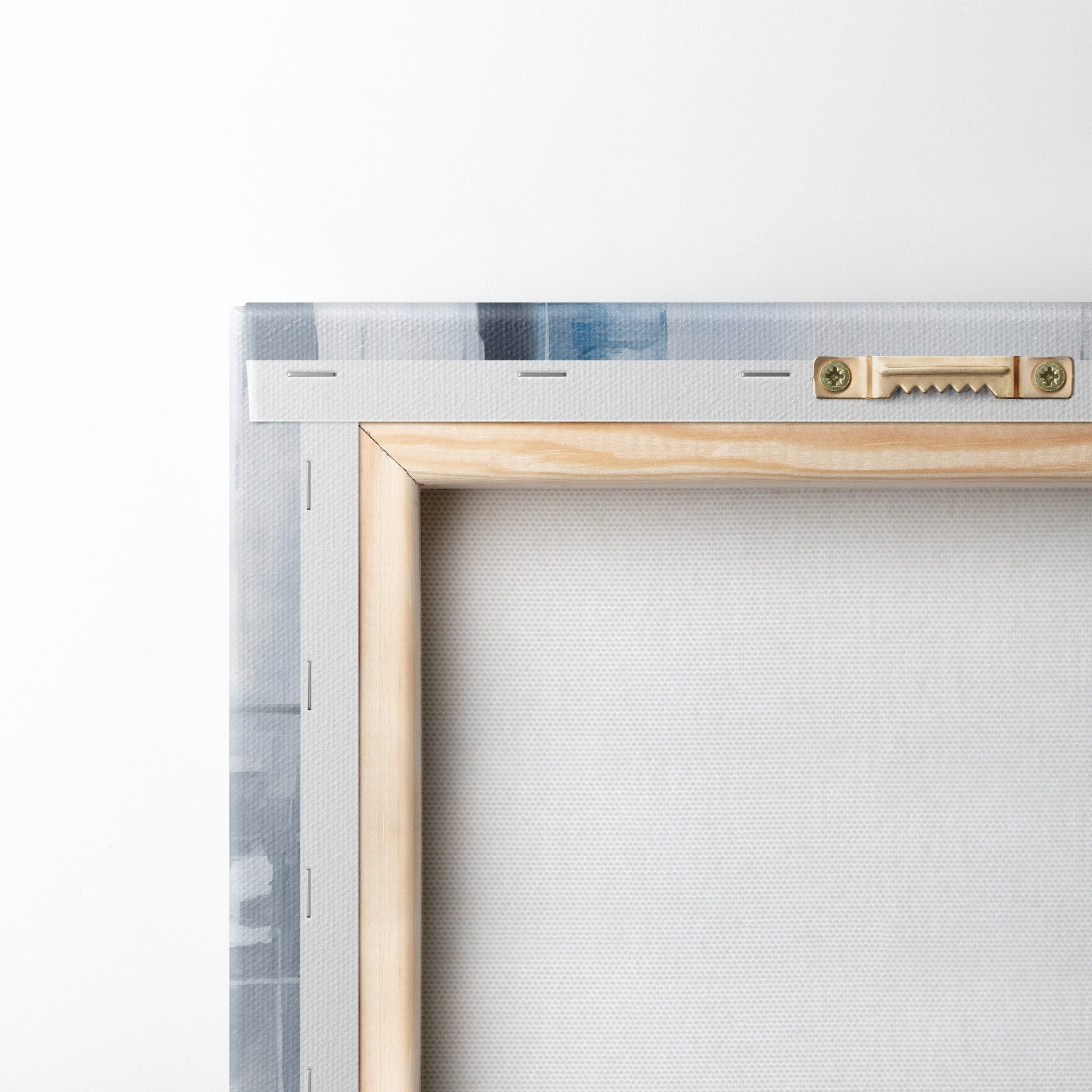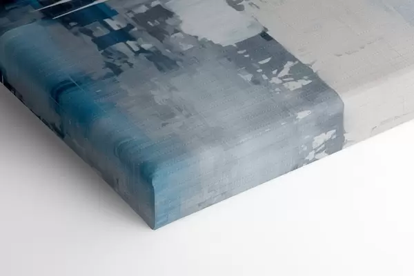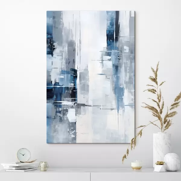 Obraz Abstraktná maľba s modrou, šedou a bielou farbou, vertikálnymi čiarami a geometrickými tvarmi Nr. s45926