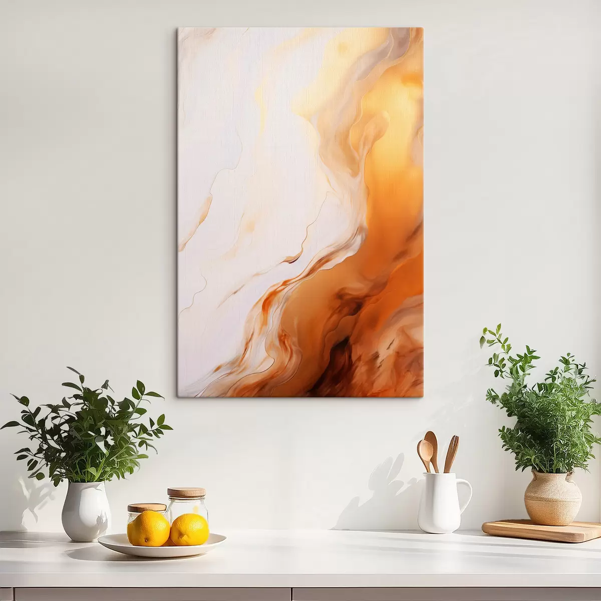 Obraz Imitácia abstraktnej maľby s bielou a oranžovou farbou, fluidné umenie s vlnitými líniami, moderné umenie Nr. s45939
