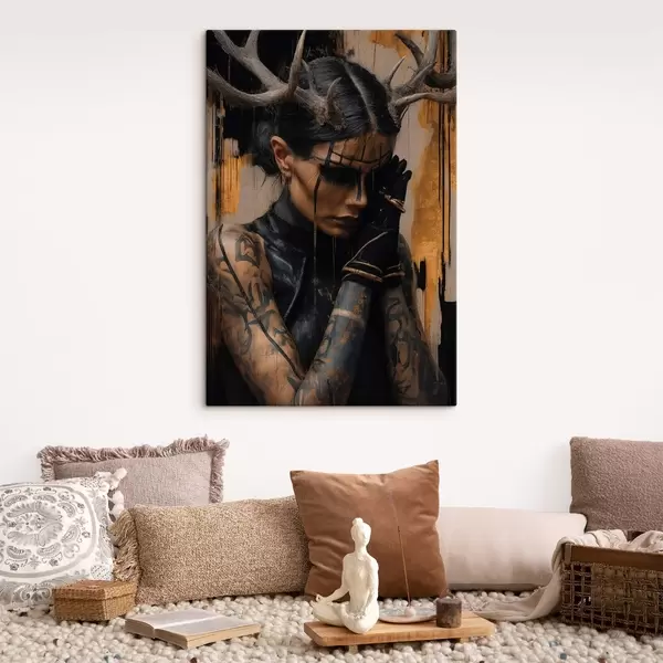Obraz Žena s rohmi v tmavom vzhľade s čiernymi črtami na tvári Nr. s46144