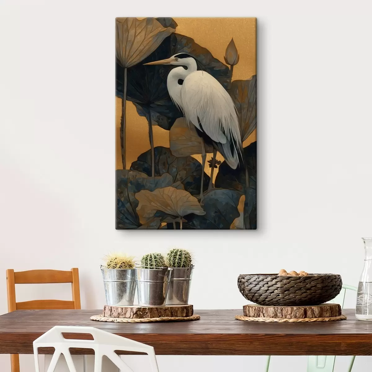 Obraz Biela volavka medzi veľkými listami na teplom pozadí Nr. s46147