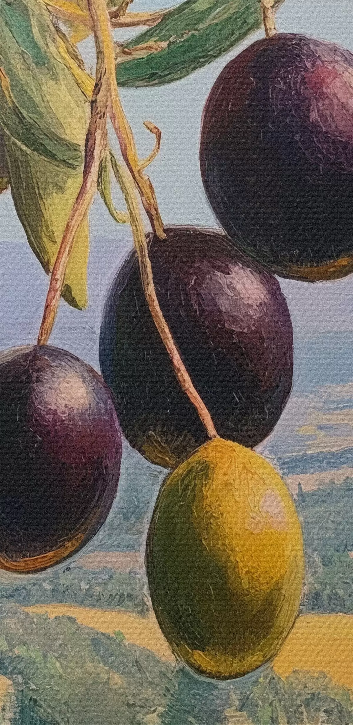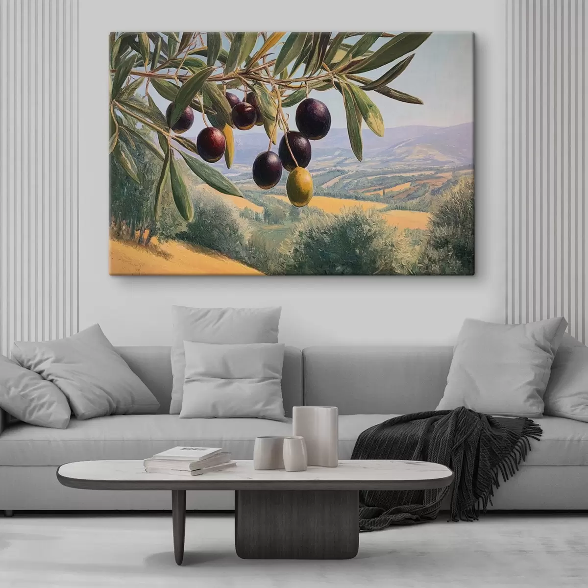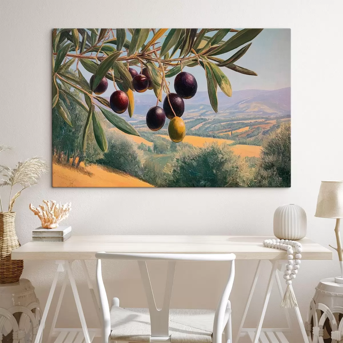 Obraz Olivová ratolesť s tmavými plodmi na pozadí letnej krajiny Nr. s46150