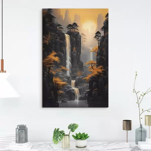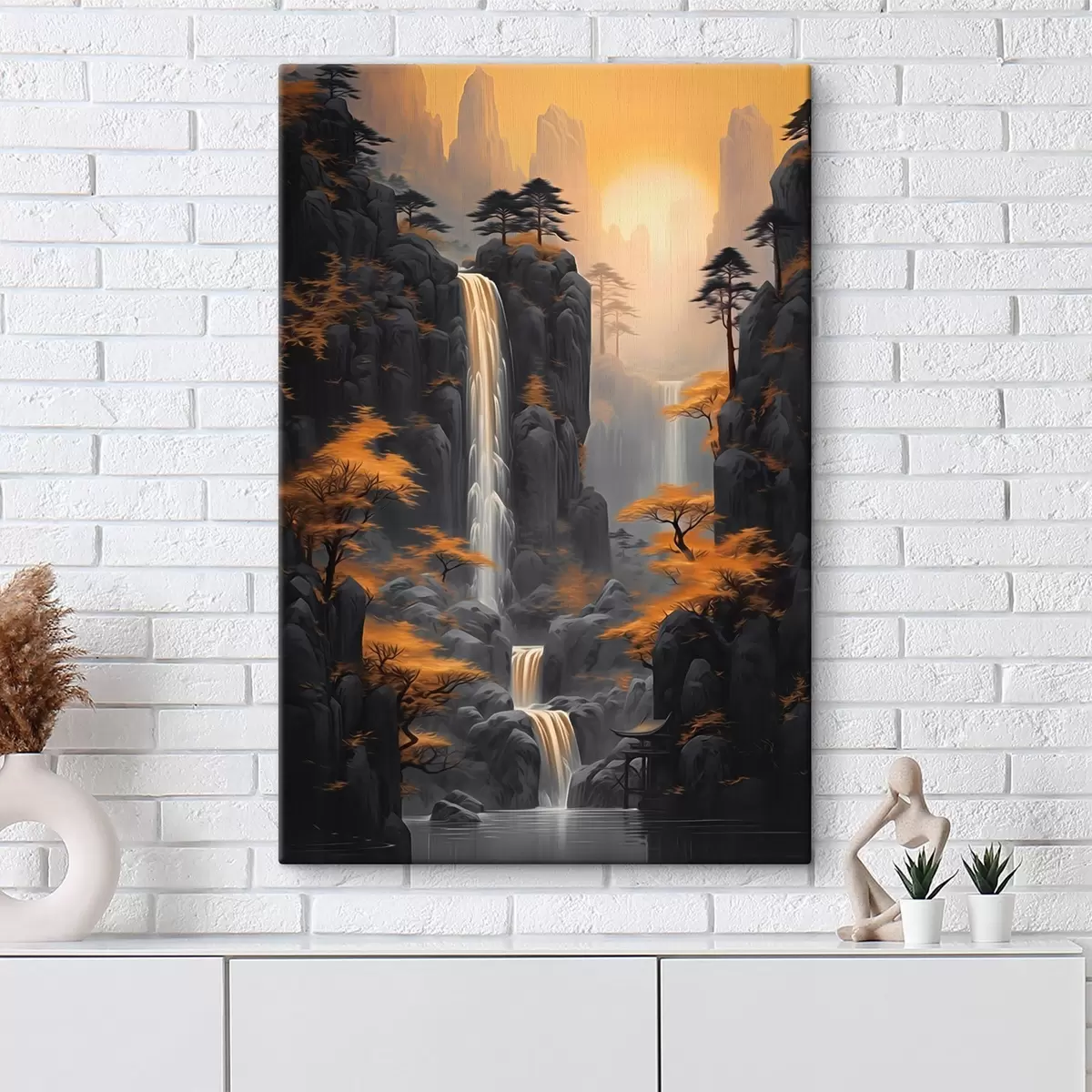 Obraz Skalnatá krajina s vodopádom v teplých farbách západu slnka Nr. s46177