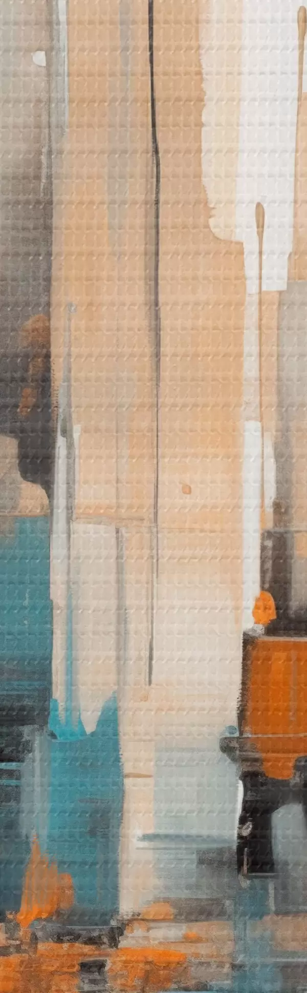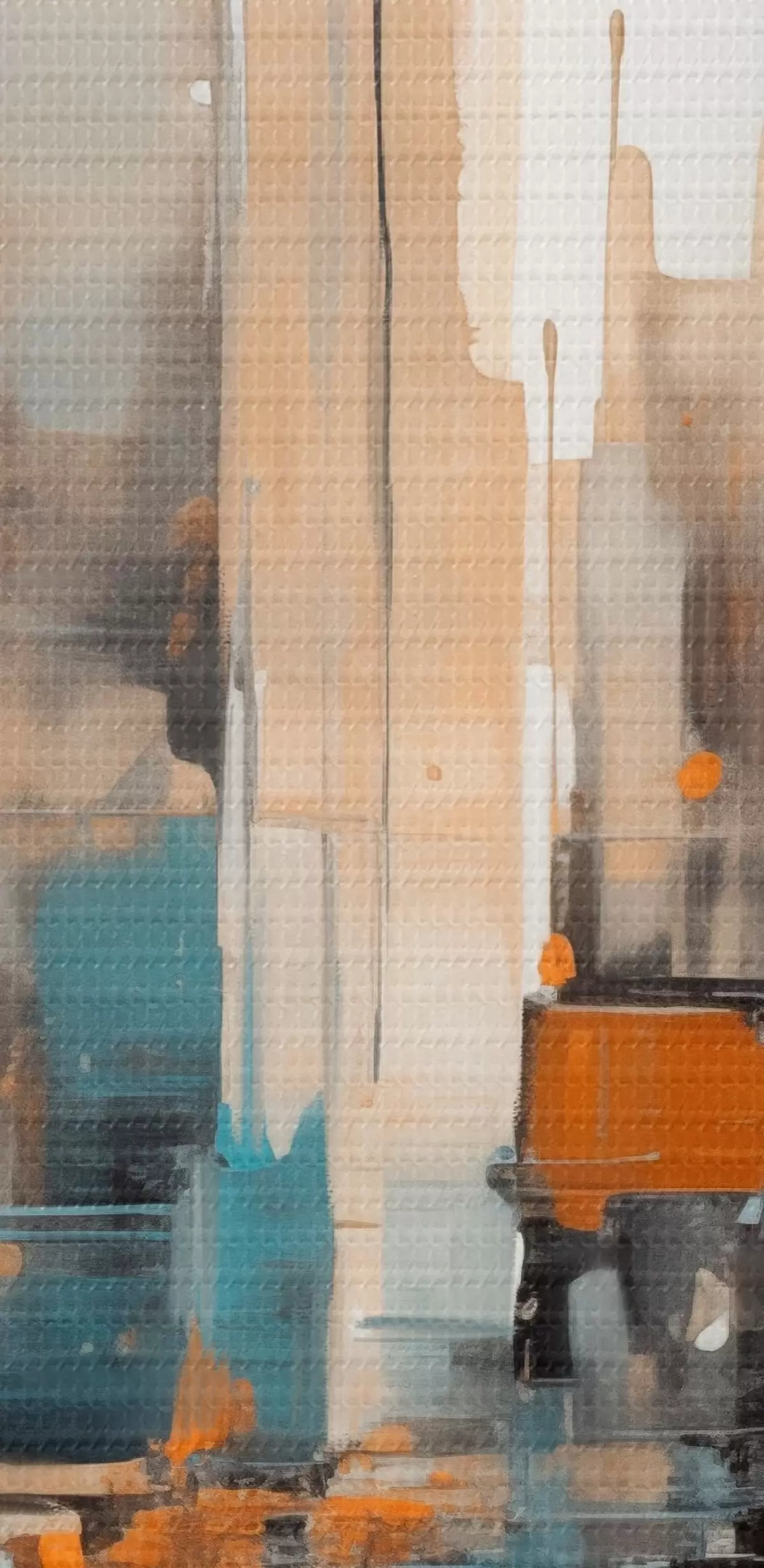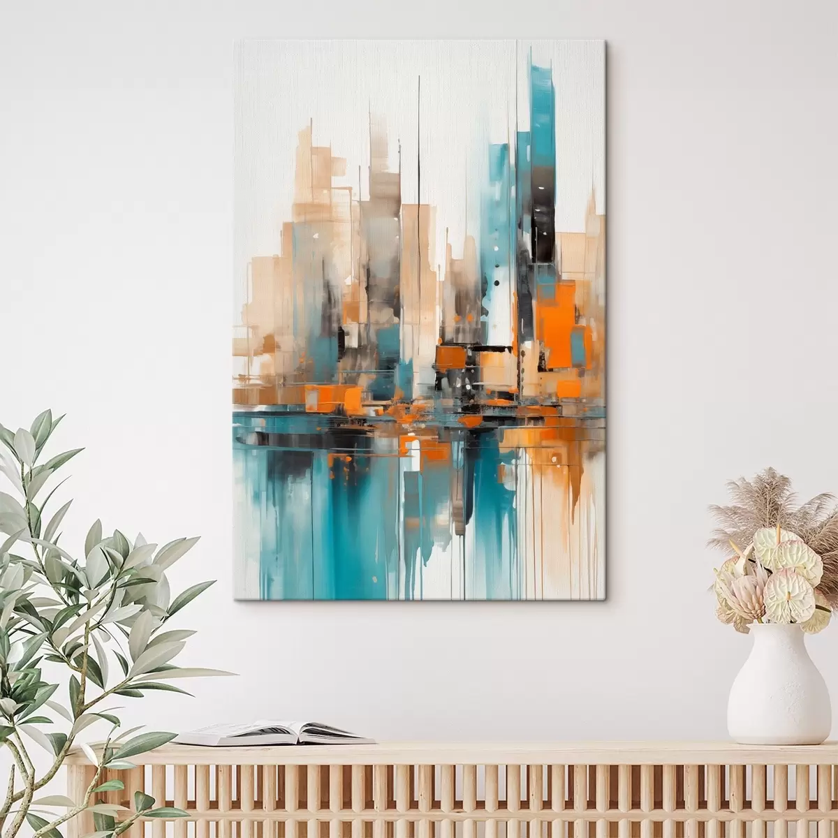 Obraz Abstraktný mestský panoráma s oranžovými, tyrkysovými a hnedými vertikálnymi ťahmi štetcom a geometrickými tvarmi Nr. s46266