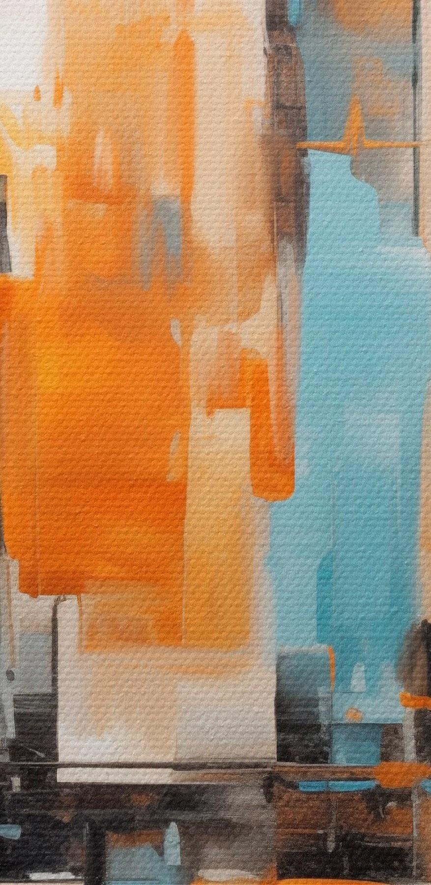 Obraz Abstraktný mestský panoráma s vertikálnymi ťahmi štetcom v odtieňoch oranžovej, modrej a bielej, maliarsky štýl Nr. s46267