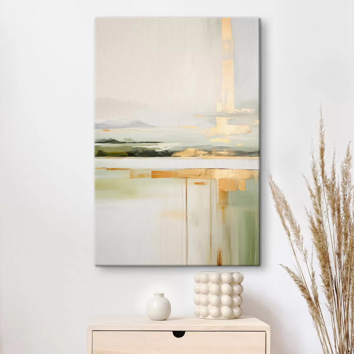 Obraz Abstraktná krajina so žltými akcentmi, minimalistická kompozícia zeme, vody a oblohy, s tlmenými farbami Nr. s46268