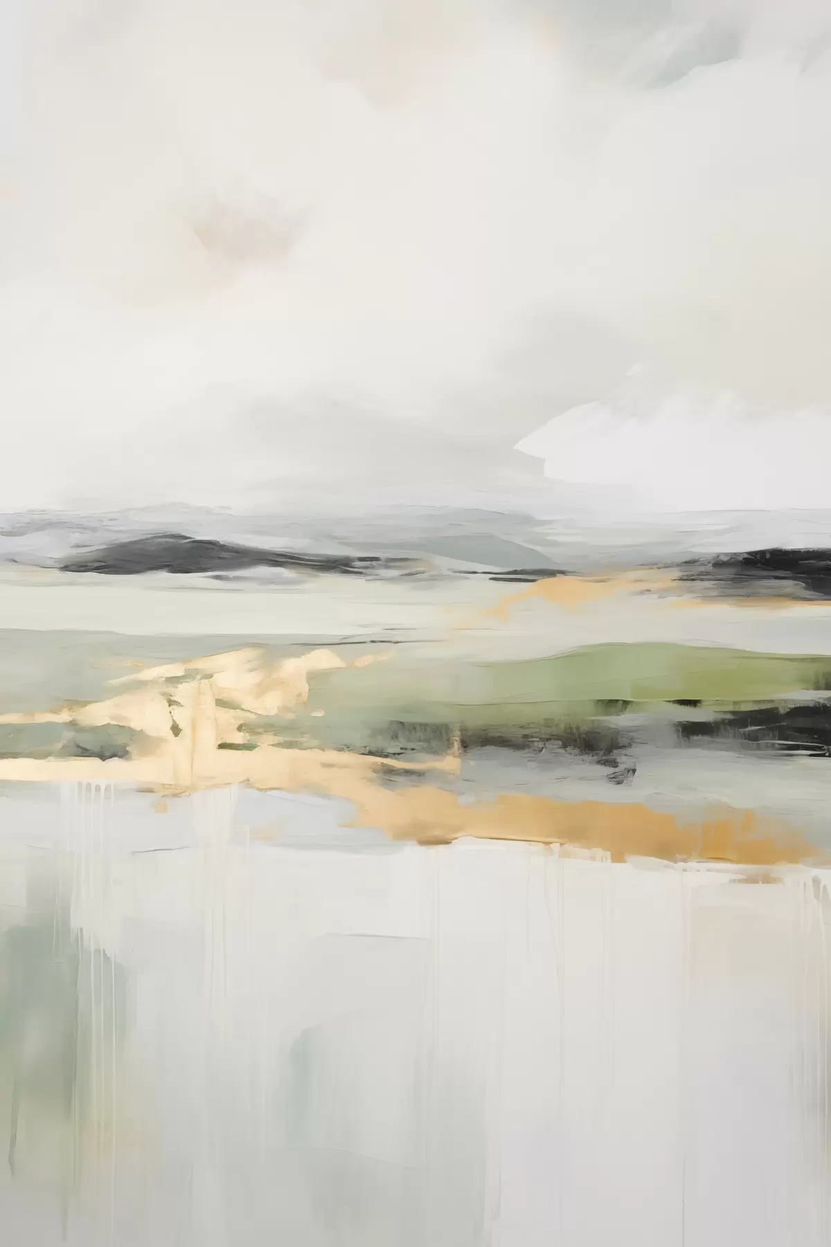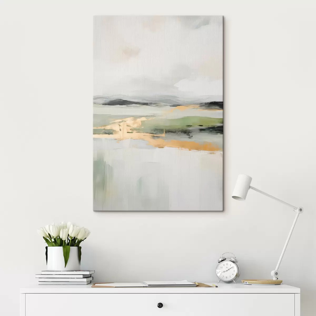 Obraz Abstraktná krajina so žltými akcentmi, minimalistická kompozícia zeme, vody a oblohy, s tlmenými farbami Nr. s46269