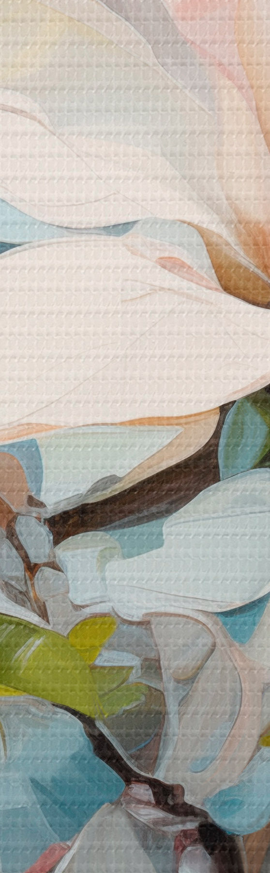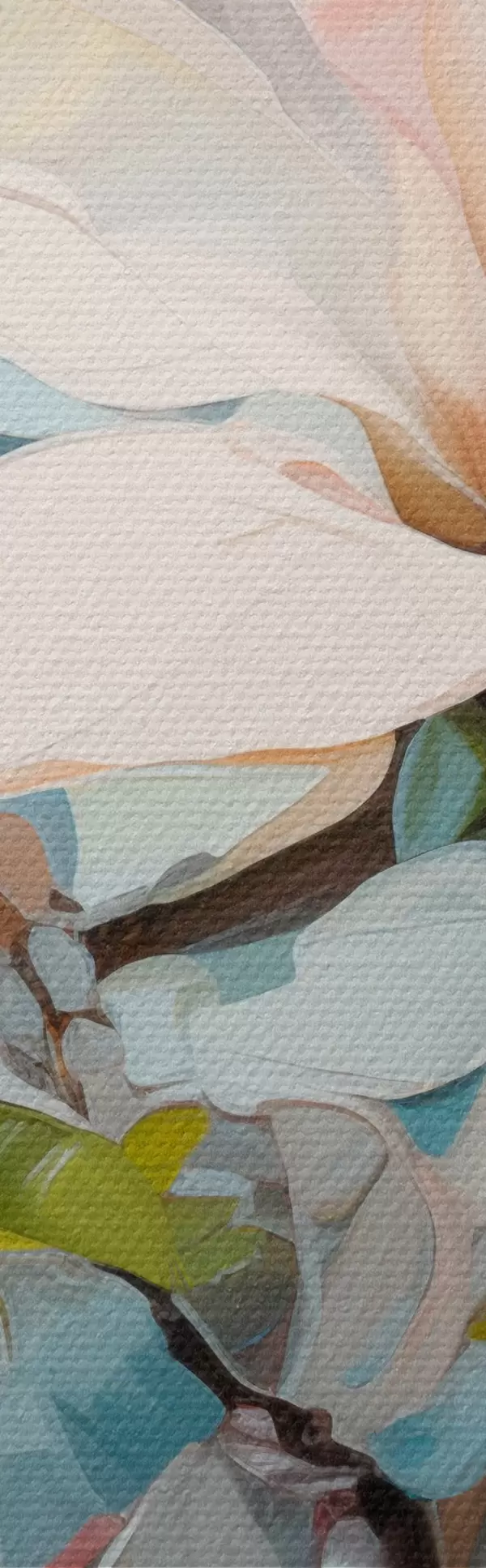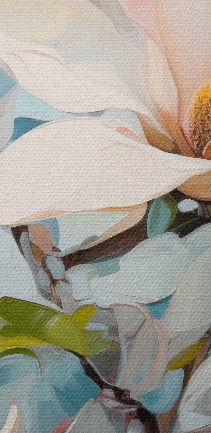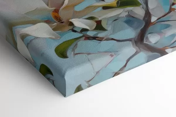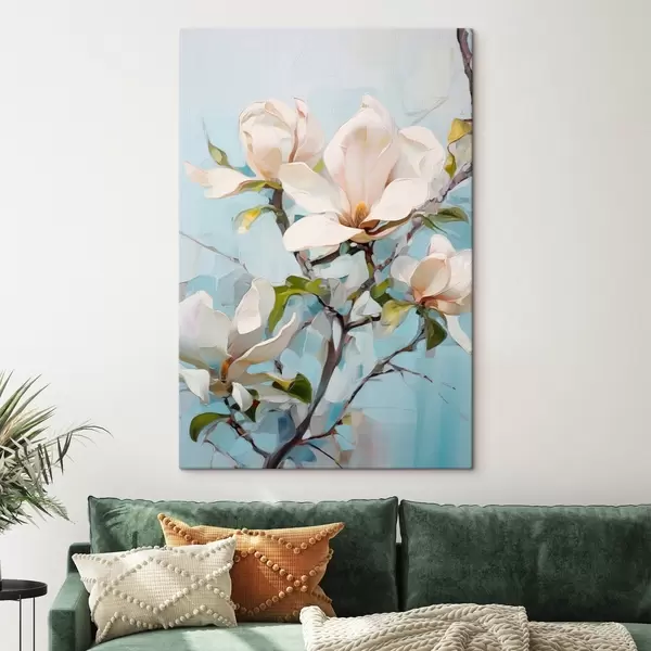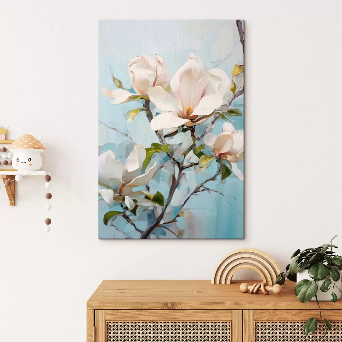 Obraz Biele kvety magnólie, svetlo modré pozadie s jemnými ťahmi štetca, štýl olejomaľby, impasto textúra Nr. s46277