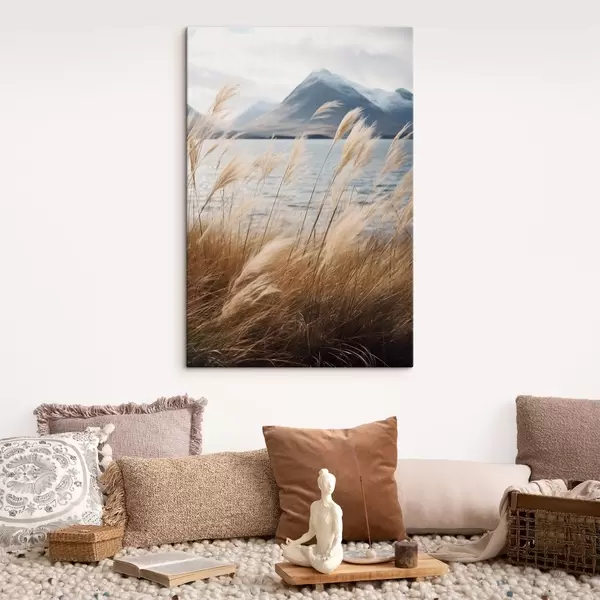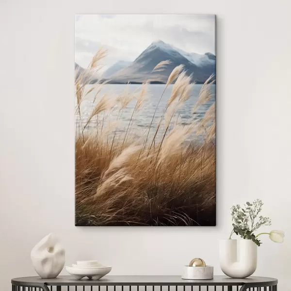 Obraz Pampasová tráva s jazerom a horami v pozadí, mäkké osvetlenie, tlmené farby, naturalistický štýl Nr. s46283