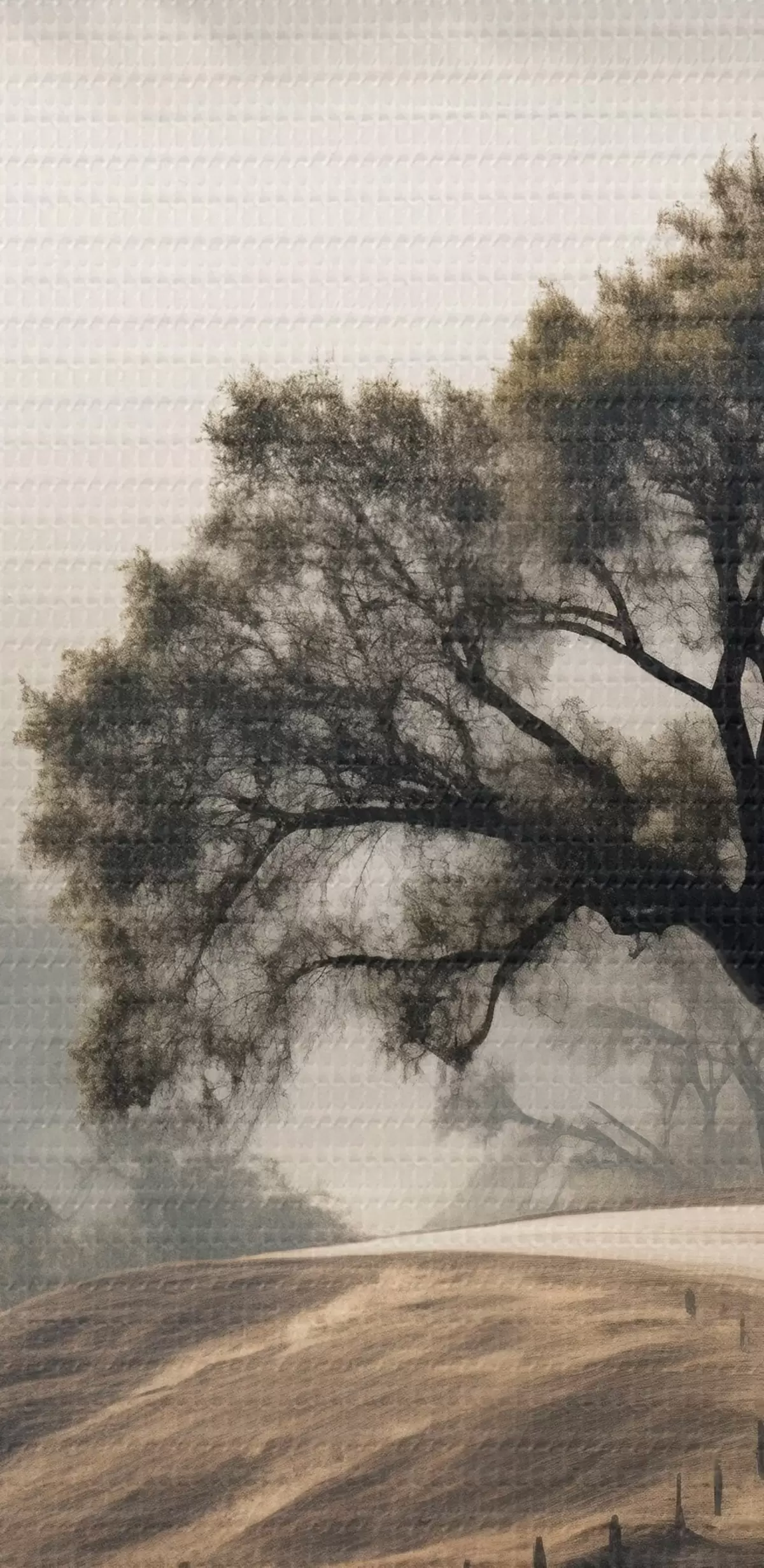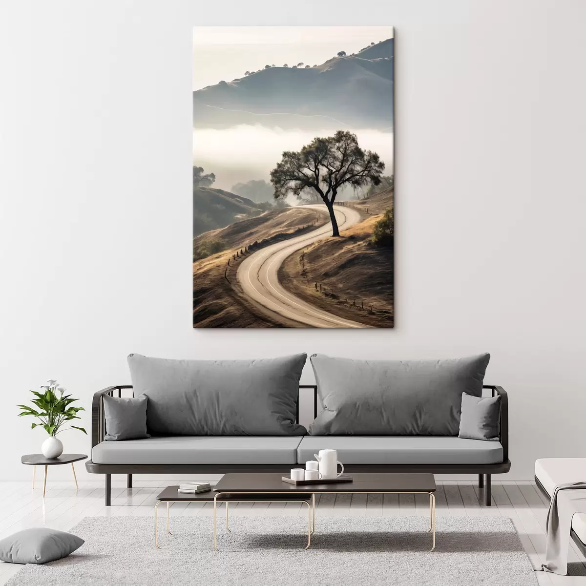 Obraz Kľukatá cesta cez zvlnené kopce s stromom v popredí, v pozadí hmla a hory Nr. s46288