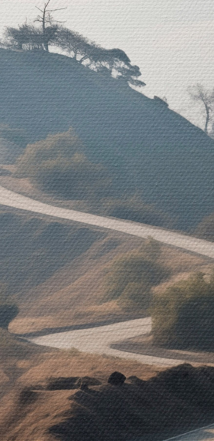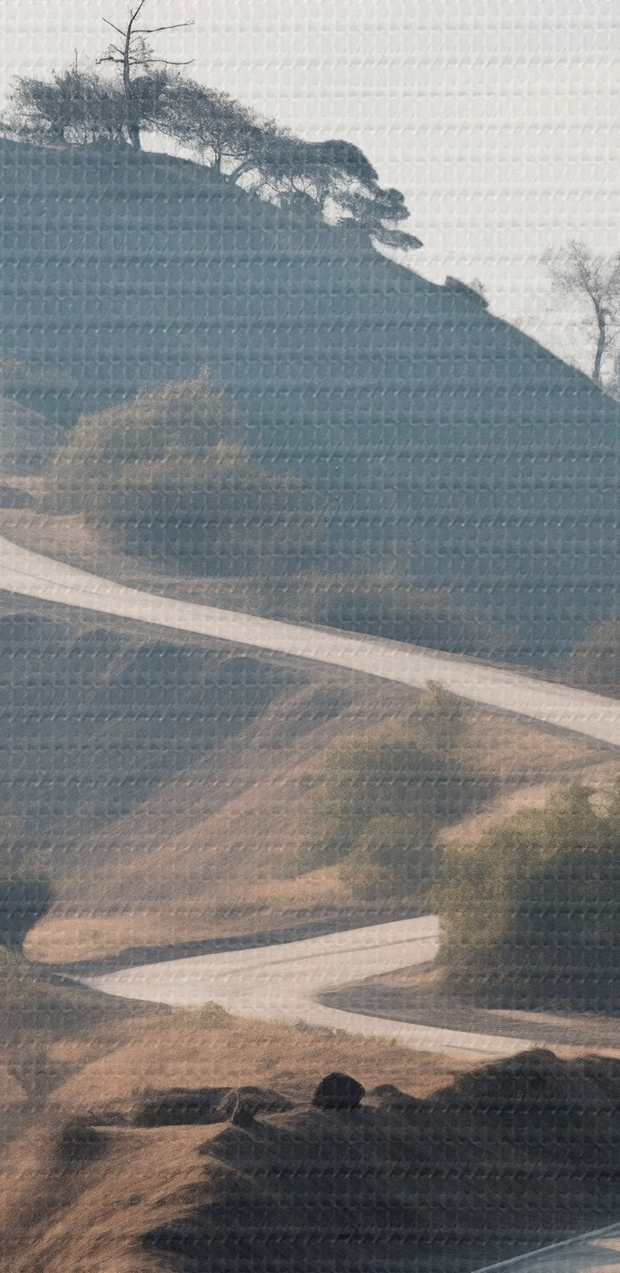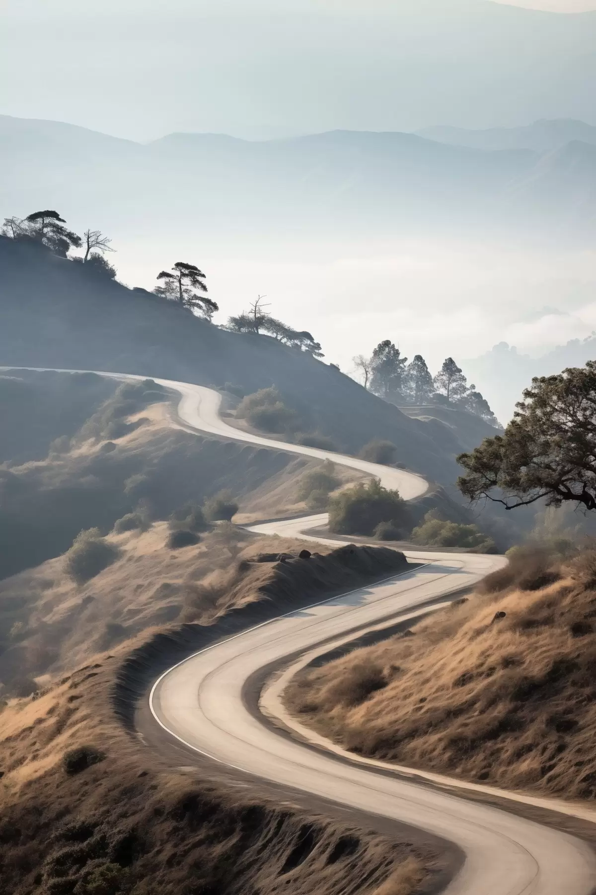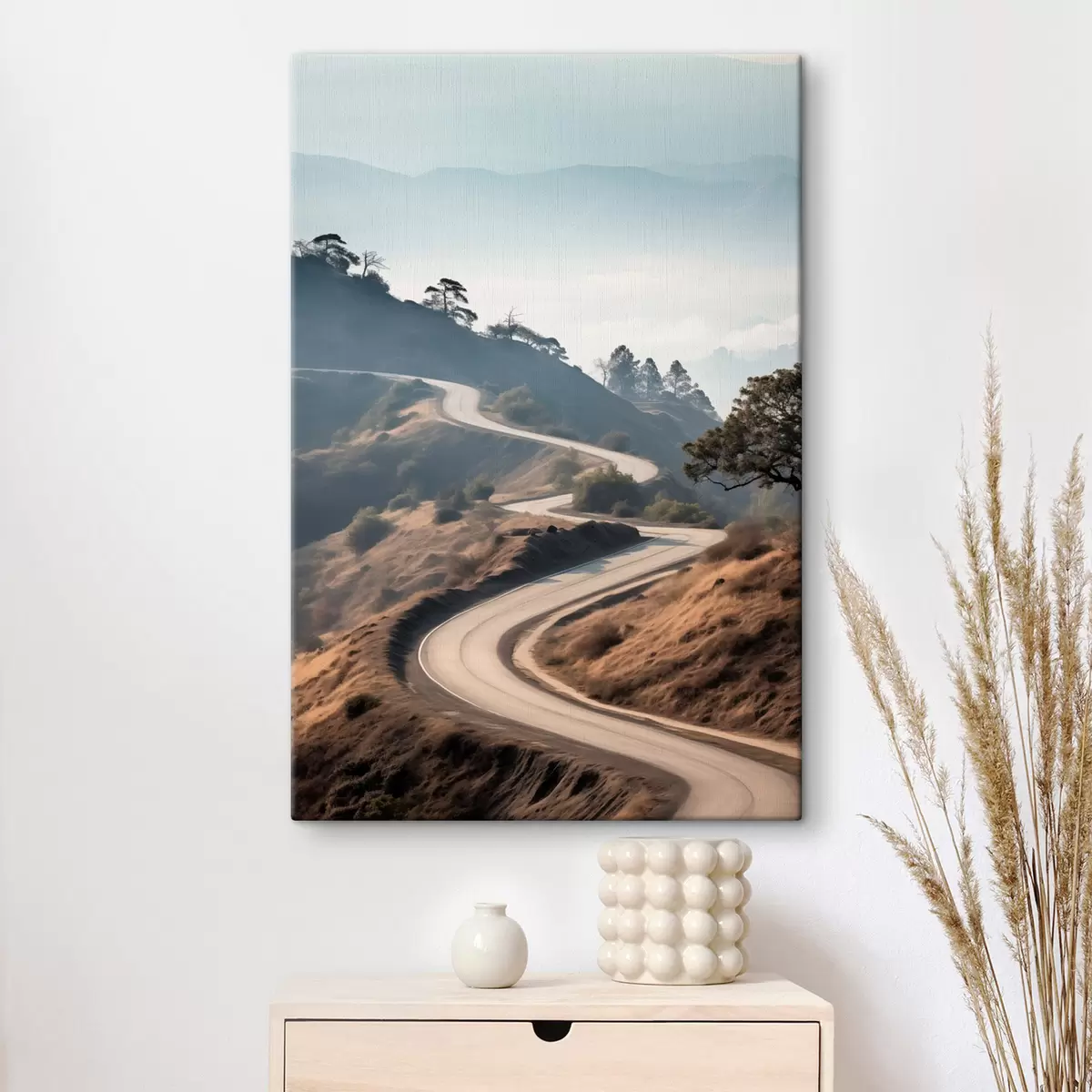 Obraz Kľukatá cesta cez kopcovitú krajinu so suchou trávou pod jasnou oblohou s horami v diaľke Nr. s46289