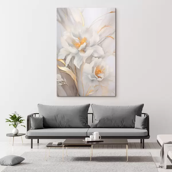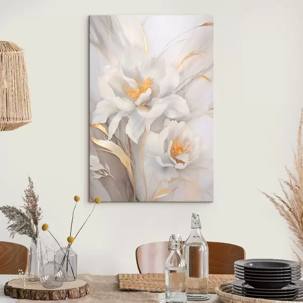 Obraz Biele kvety so žltými piestikmi a stonkami, jemné okvetné lístky, elegantná kompozícia, neutrálne pozadie Nr. s46293