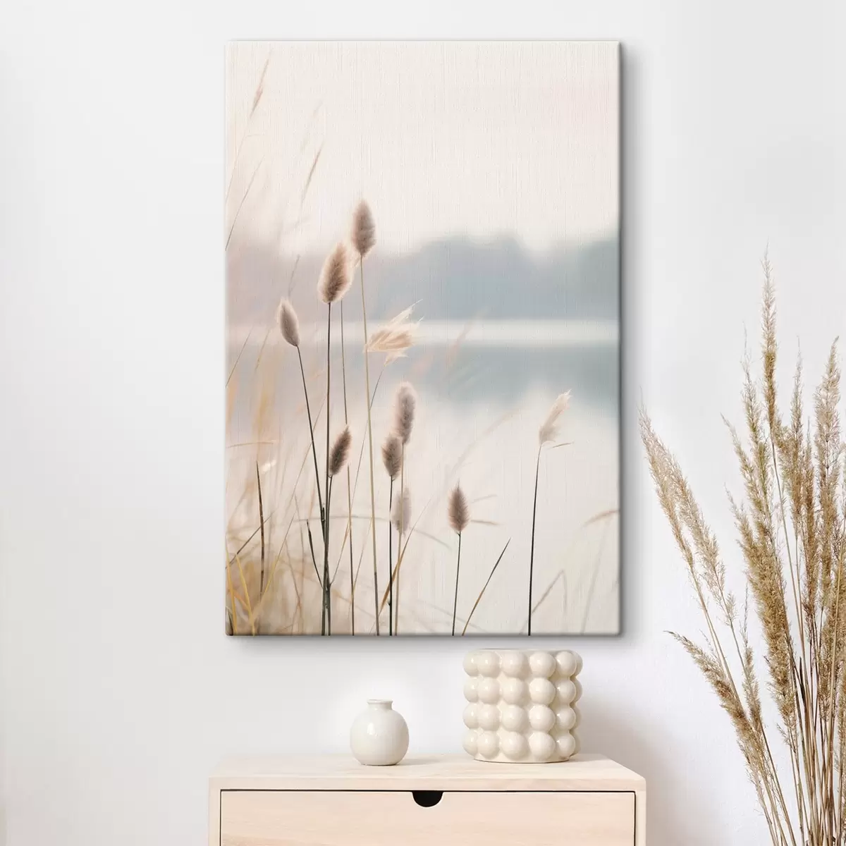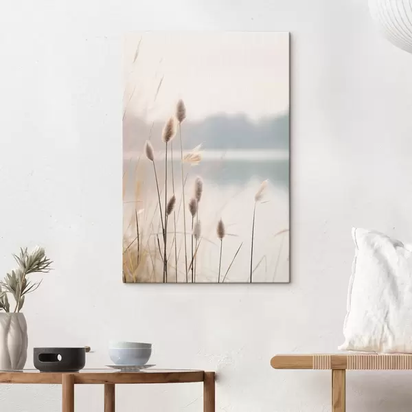 Obraz Mäkké trstiny pri hmlistom brehu jazera, pastelové béžové tóny Nr. s46504