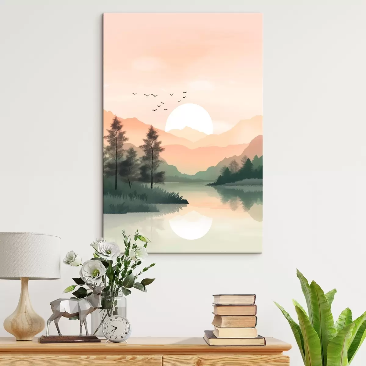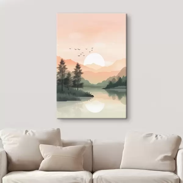 Obraz Pastelový západ slnka nad pokojným jazerom s vzdialenými kopcami a vtákmi Nr. s46508