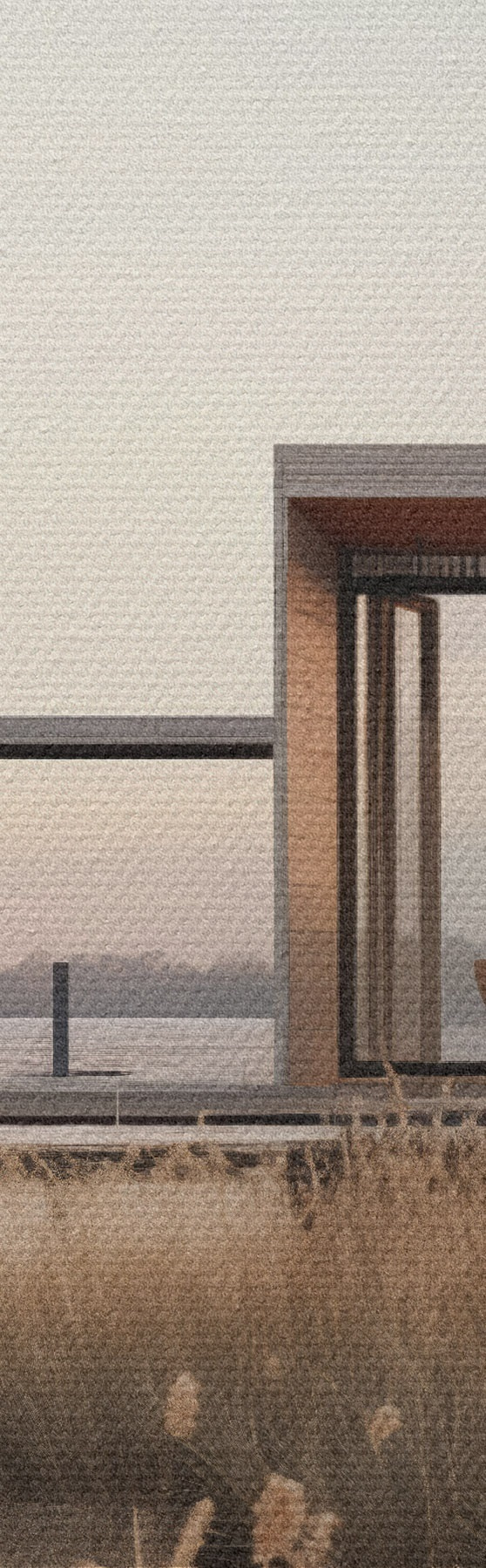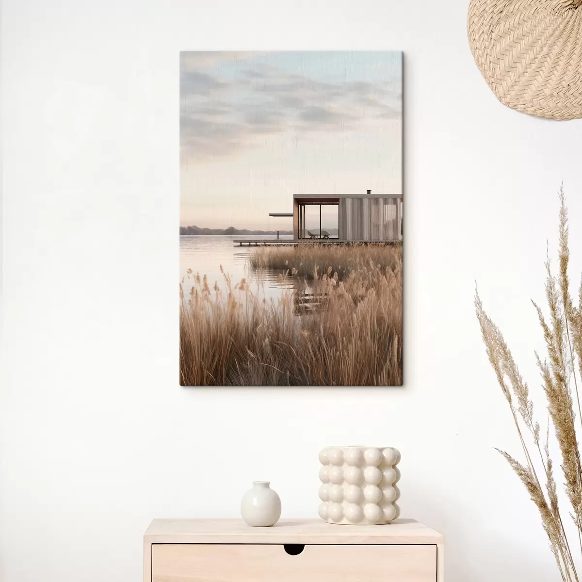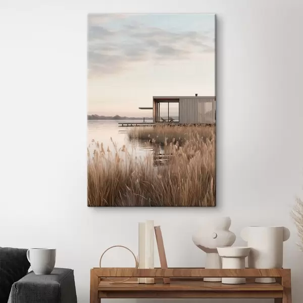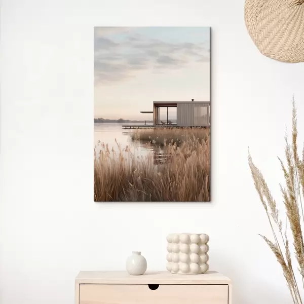 Obraz Moderná chata pri jazere medzi rákosím v jemnom súmraku Nr. s46513
