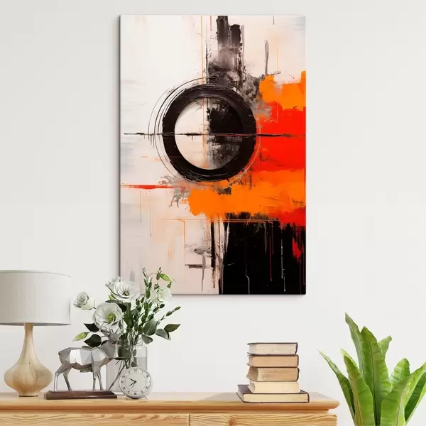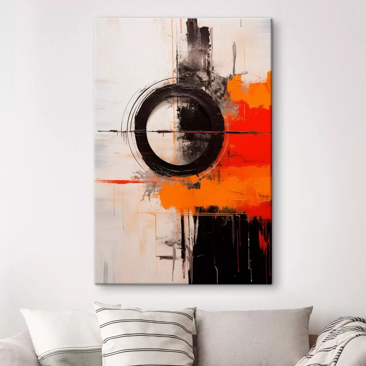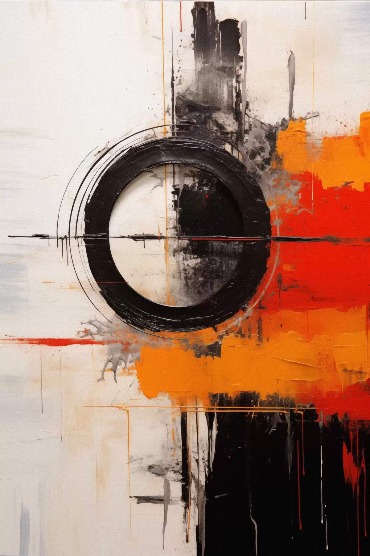 Obraz Čierny kruh na bielom pozadí, oranžové ťahy a škvrny Nr. s46549