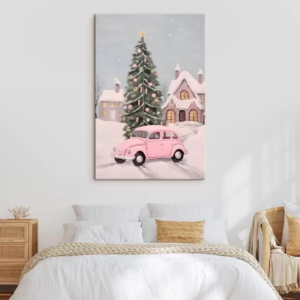 Obraz Ružové auto a vyzdobený vianočný stromček pred domom Nr. s46621