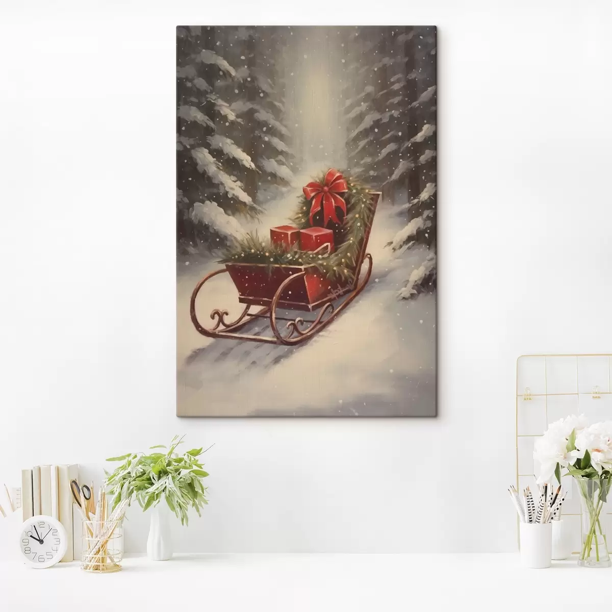 Obraz Vianočné sane s darčekmi v zasneženom lese Nr. s46630