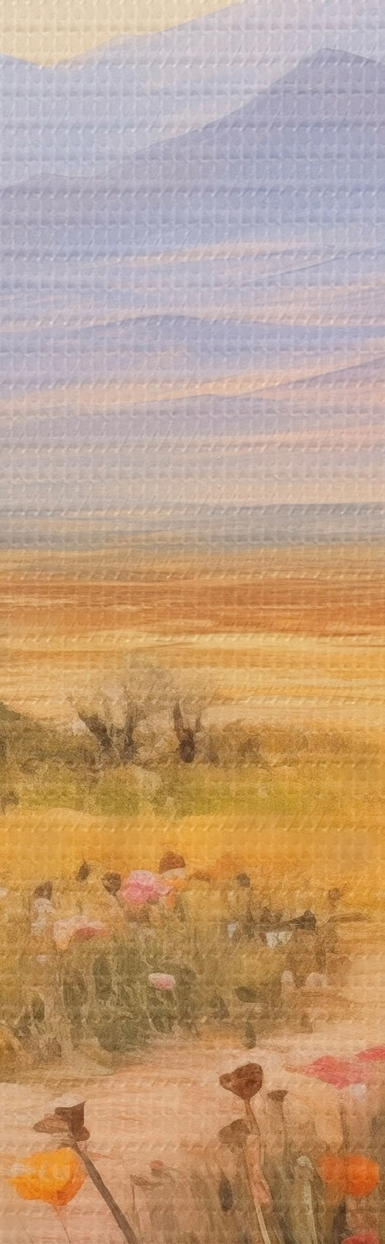 Obraz Krajina, pole farebných kvetov s horami v pozadí, jemné pastelové farby Nr. s46686