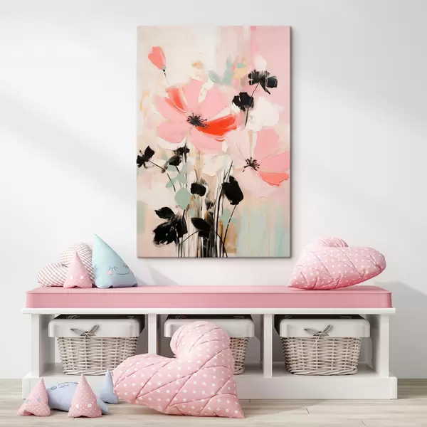 Obraz Ružové a čierne kvety s listami, jemné pastelové farby, abstraktná kvetinová kompozícia, minimalistické umenie Nr. s46687