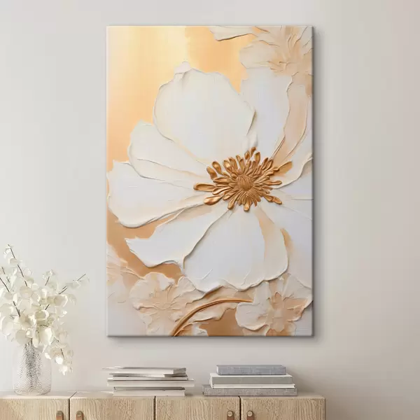 Obraz Biela kvetina s jemnými okvetnými lístkami s imitáciou hustých ťahov štetcom na svetlooranžovom textúrovanom pozadí Nr. s46691