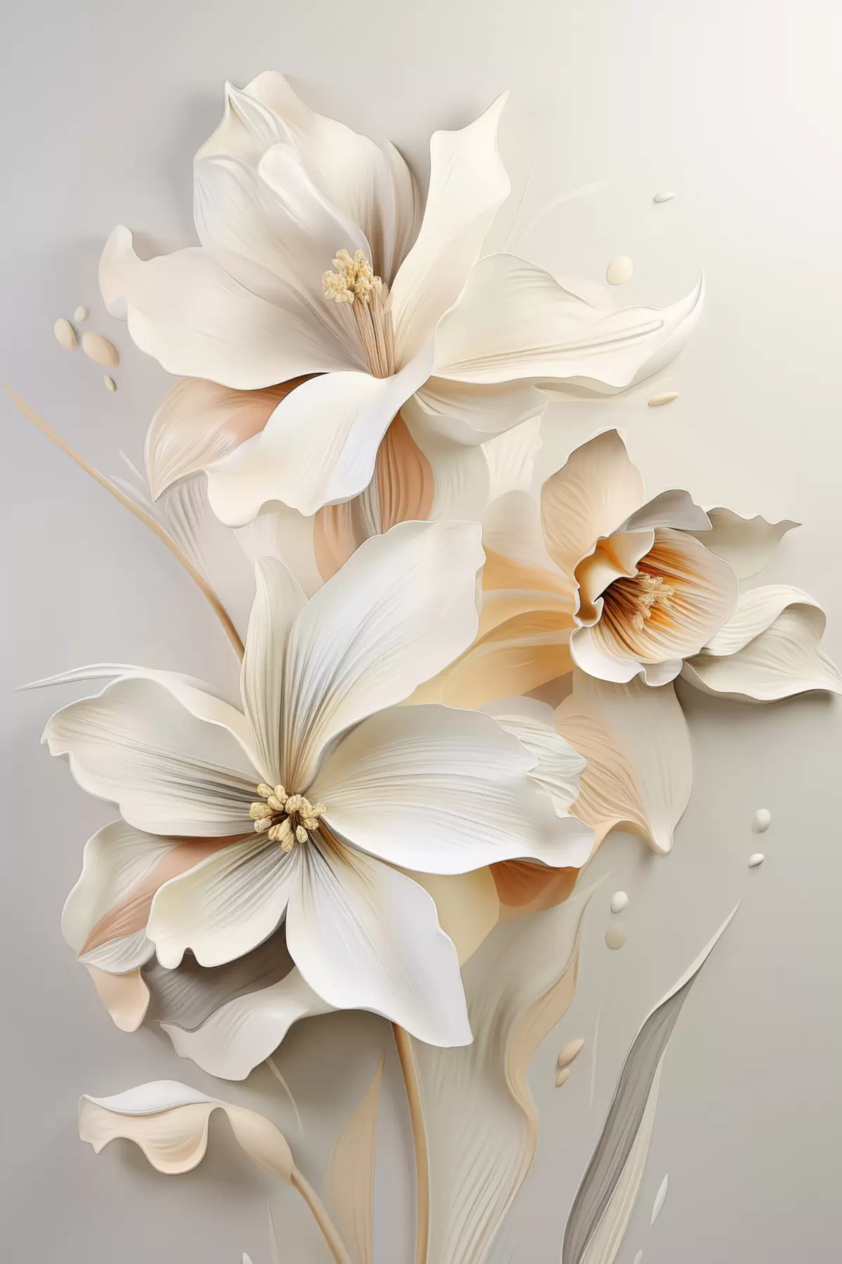 Obraz Biele kvety, okvetné lístky s jemnými tieňmi, svetlo béžové pozadie, elegantná kompozícia, minimalistický štýl Nr. s46699