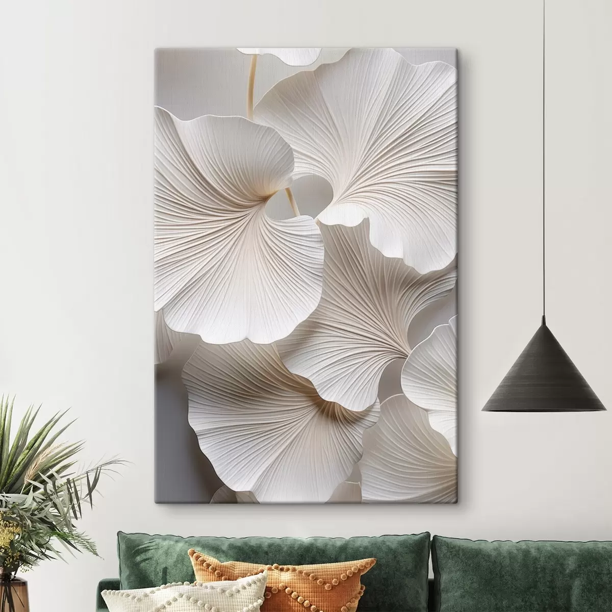 Obraz Biele listy ginkgo biloba s detailnými žilkami, jemným osvetlením, textúrovaným elegantným a minimalistickým dizajnom Nr. s46705