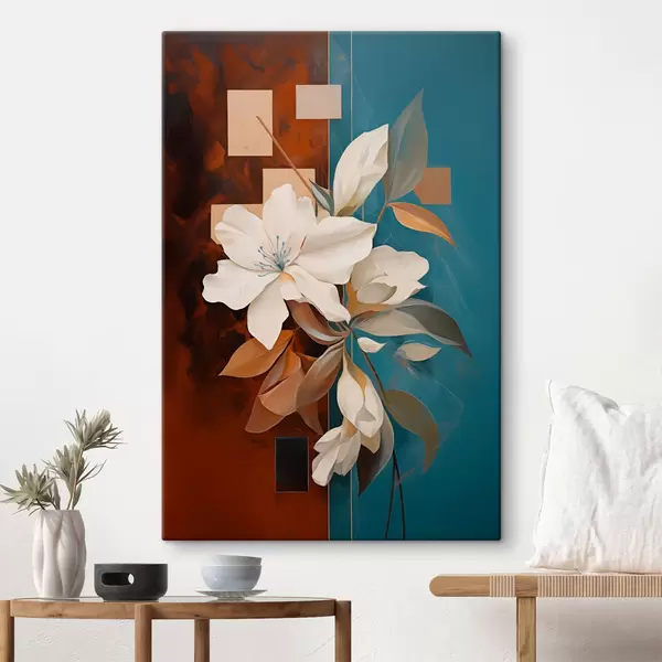 Obraz Abstraktné biele kvety a listy na pozadí hnedých a modrých abstraktných tvarov v minimalistickom štýle Nr. s46709