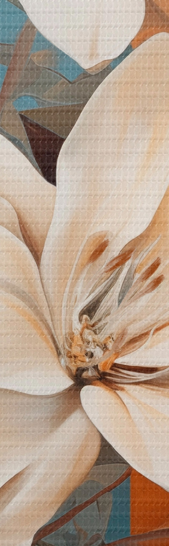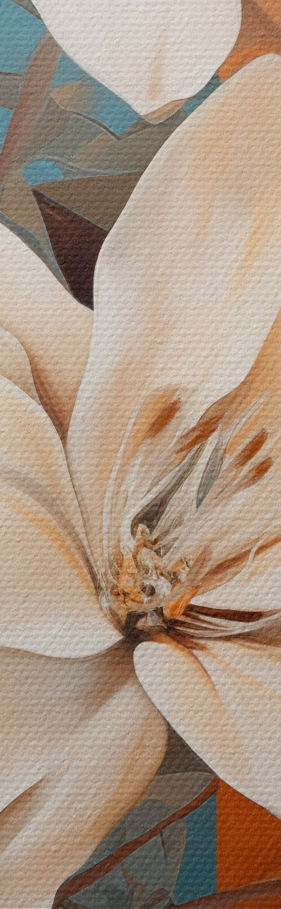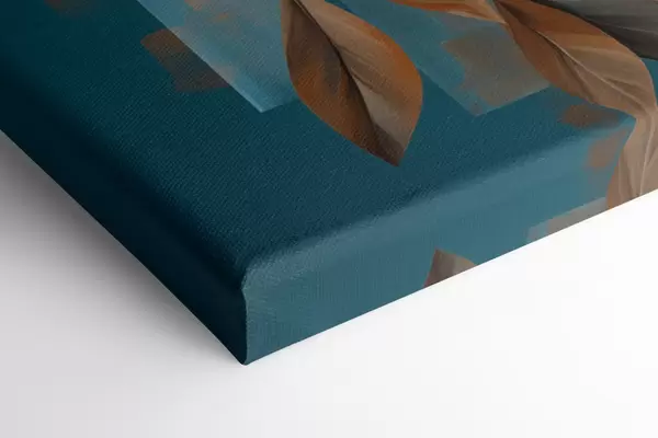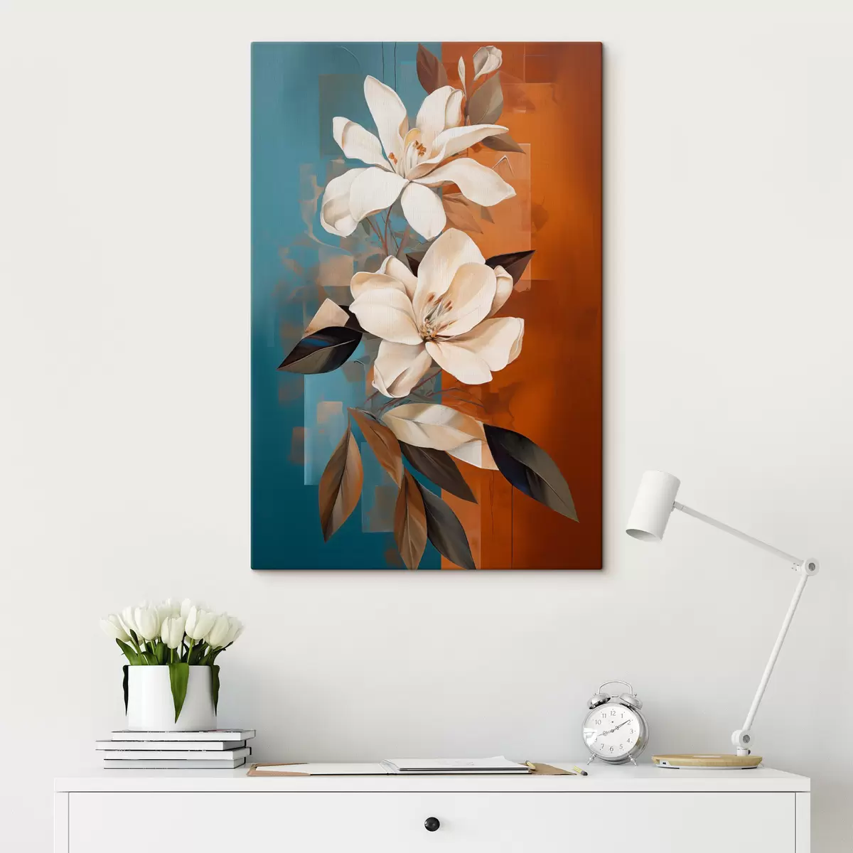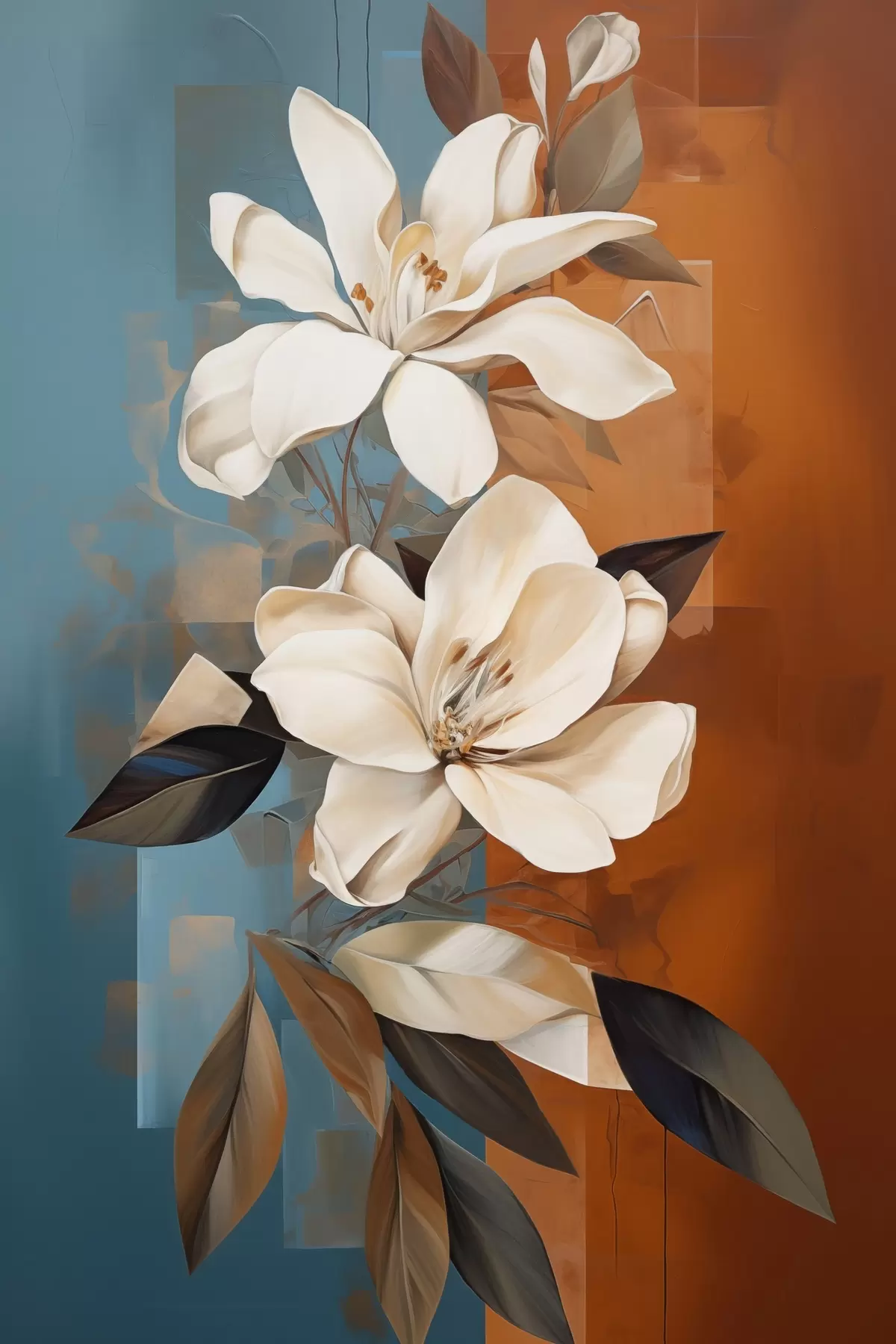 Obraz Abstraktné biele kvety a listy na pozadí hnedých a modrých abstraktných tvarov v minimalistickom štýle Nr. s46710