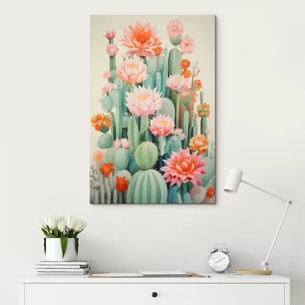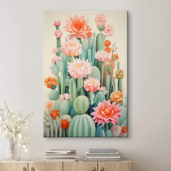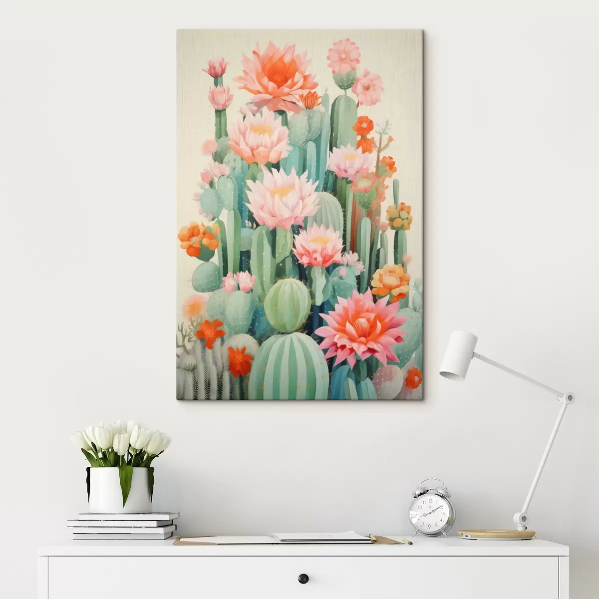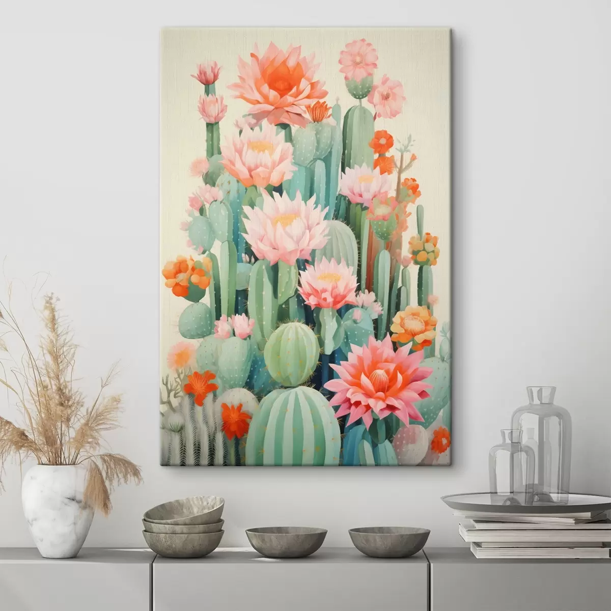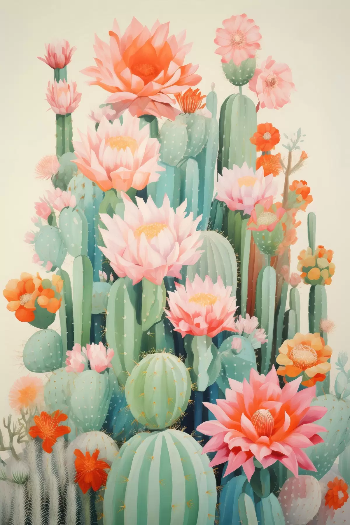 Obraz Kvitnúce kaktusy s ružovými a oranžovými kvetmi v ilustračnom štýle Nr. s46934