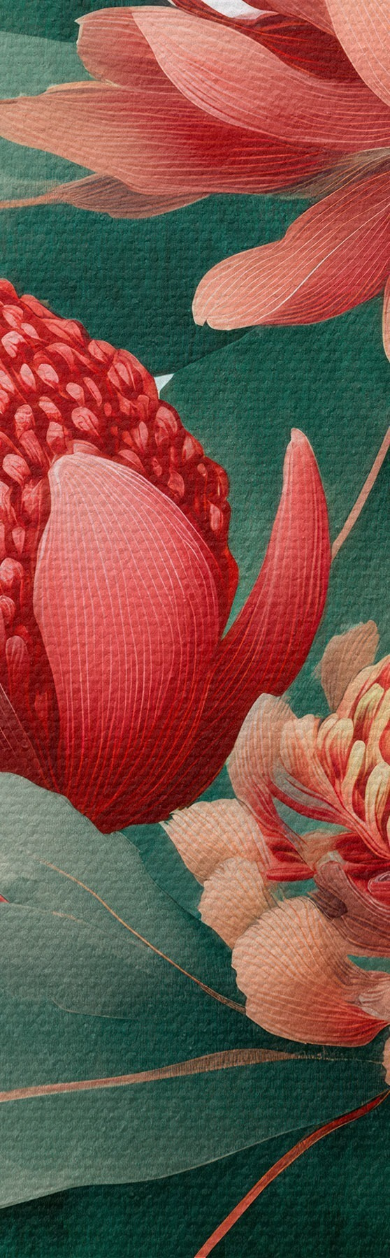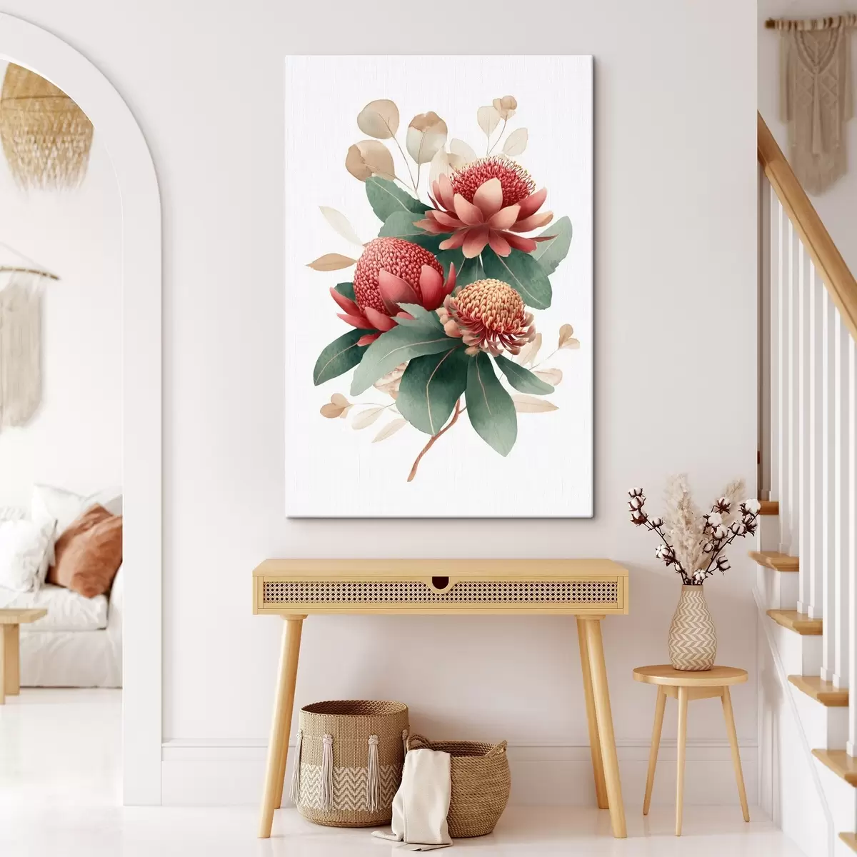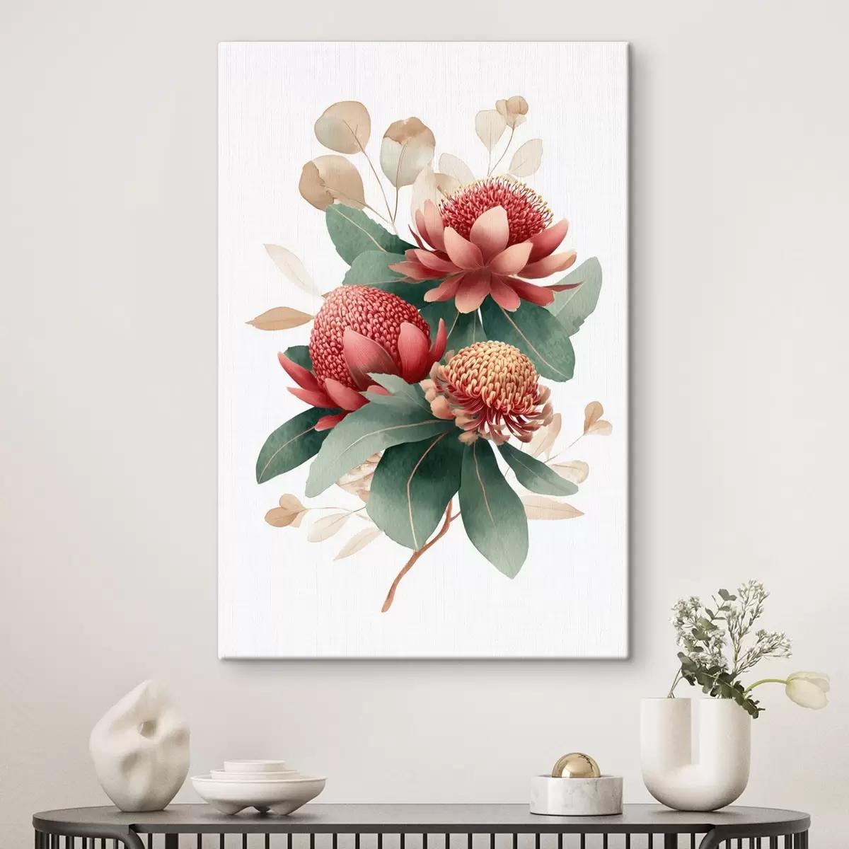 Obraz Kvetinová kompozícia s veľkými proteami a eukalyptom v modernom štýle digitálnej maľby Nr. s46955