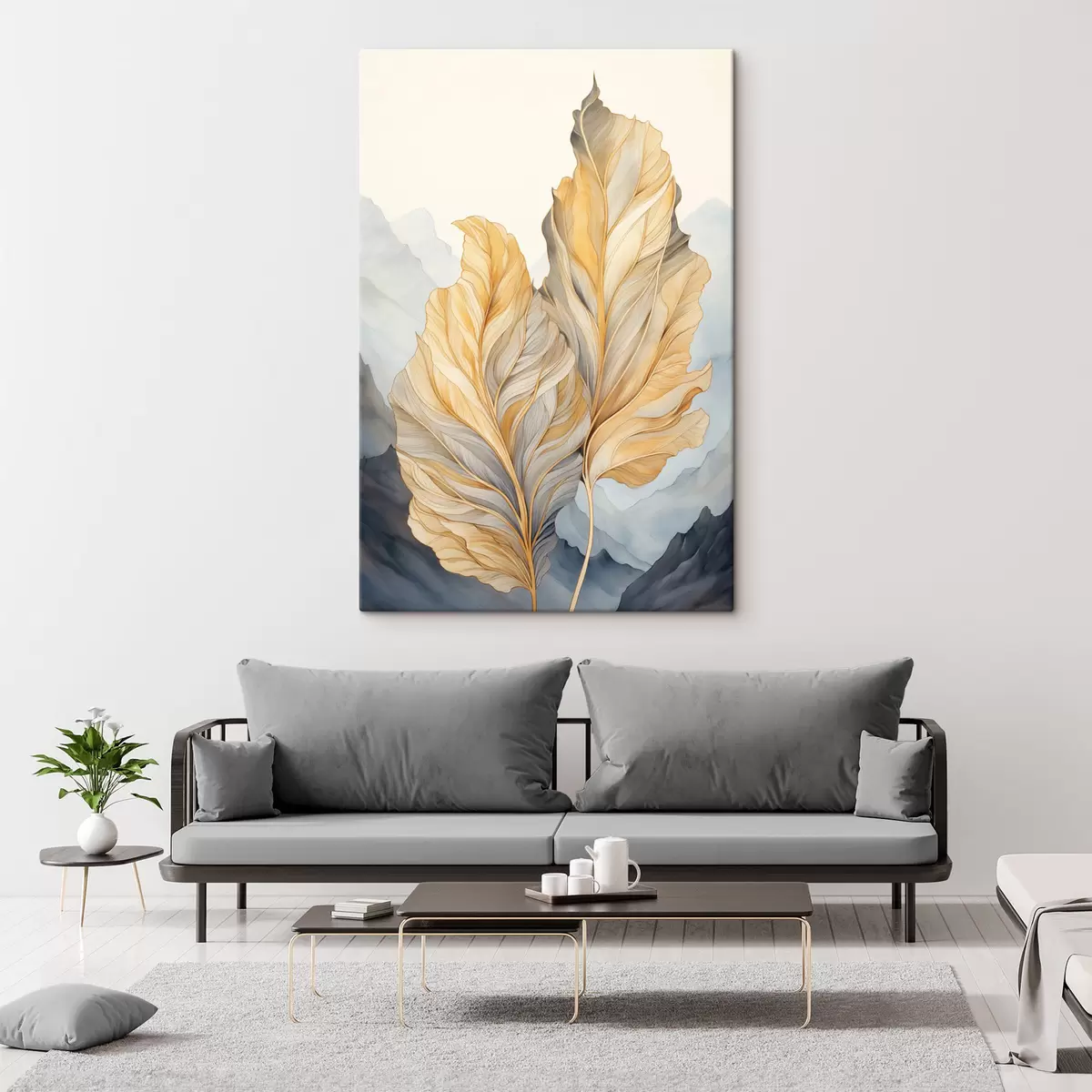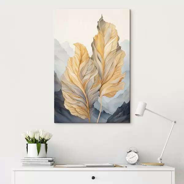 Obraz Abstraktné veľké, žlté a hnedé listy so zložitými detailmi na pozadí horskej krajiny Nr. s47023
