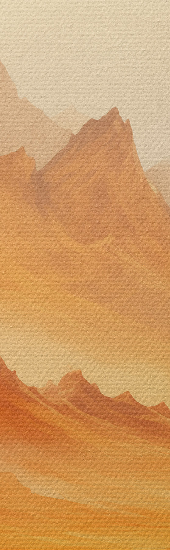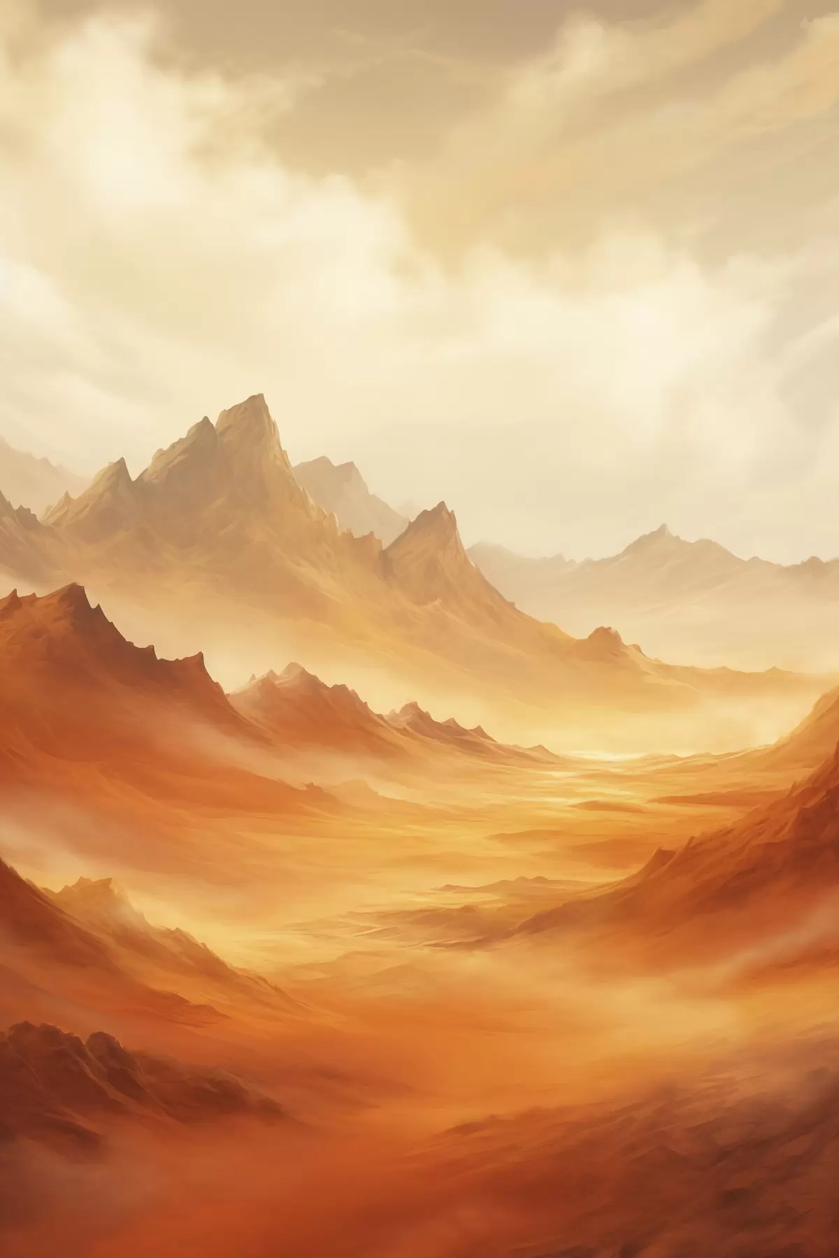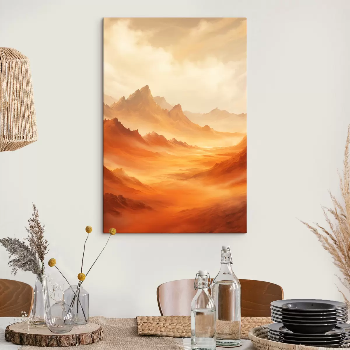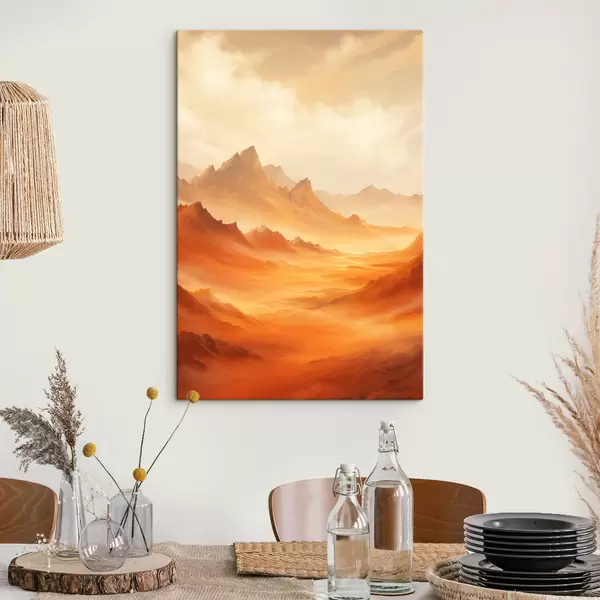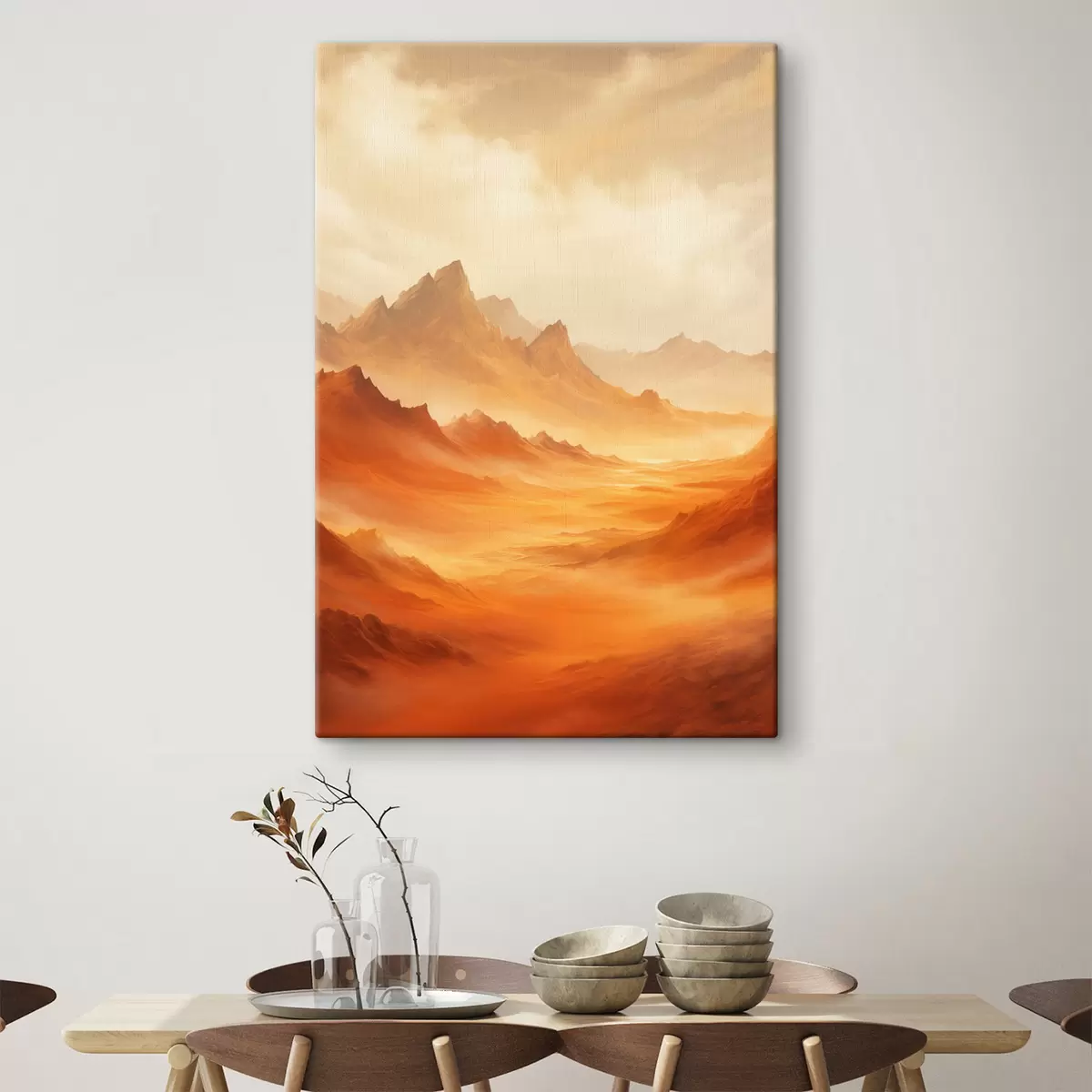 Obraz Rozľahlá oranžová púštna krajina s vysokými skalnatými horami pod zamračenou, slnkom osvetlenou oblohou s riedkymi mrakmi. Nr. s47029
