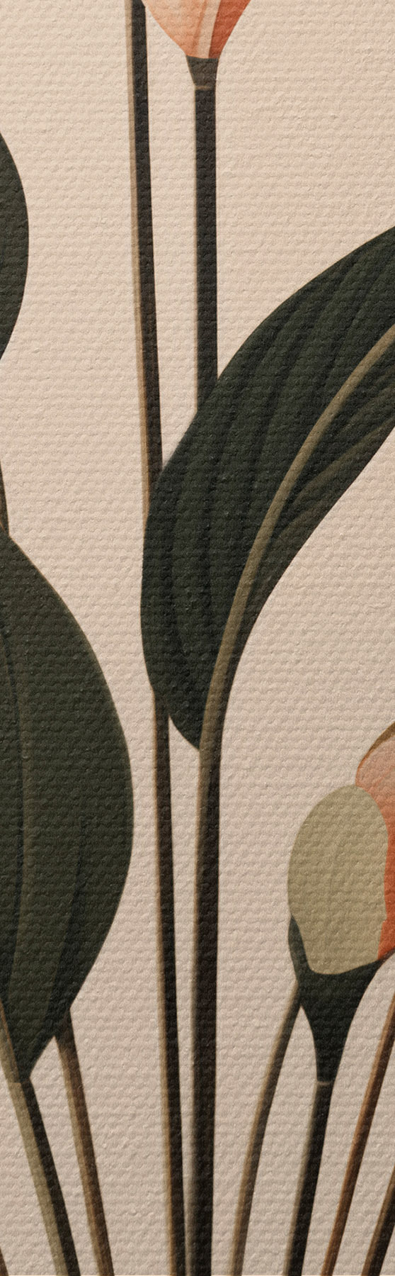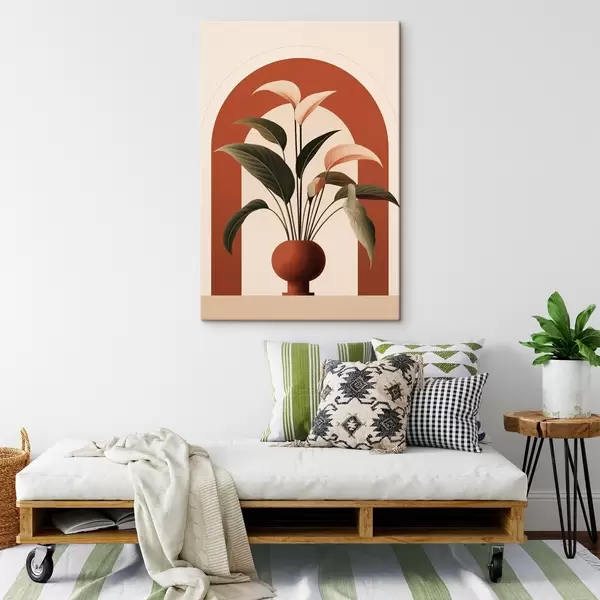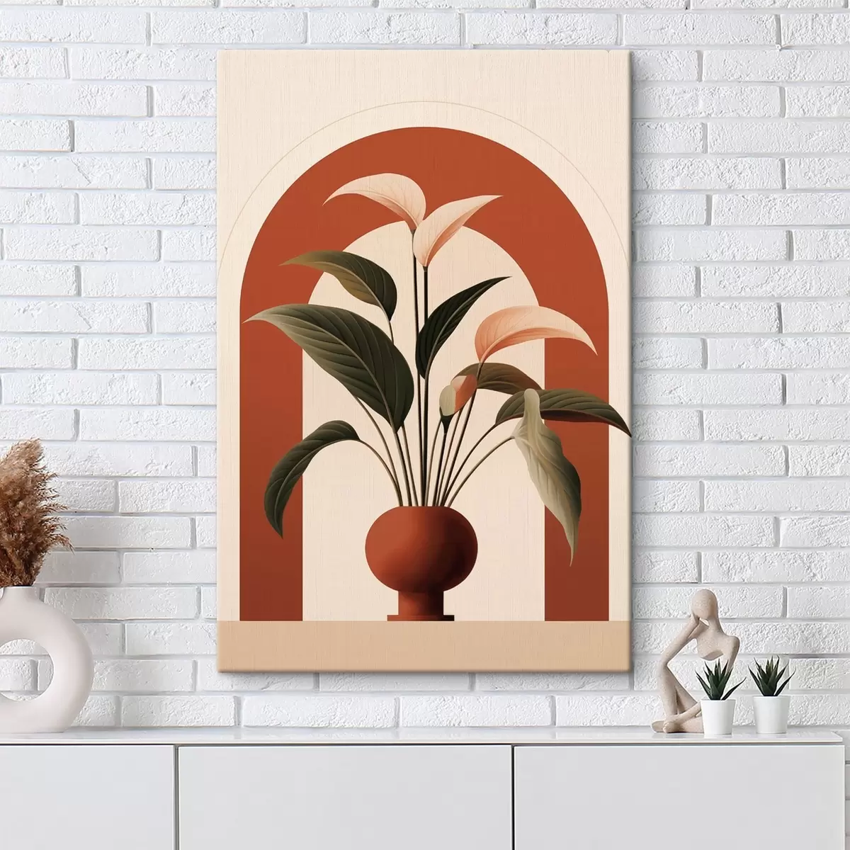 Obraz Abstraktná kvetina v črepníku s veľkými zelenými a béžovými listami pred krémovou bránou s terakotovým akcentom Nr. s47032