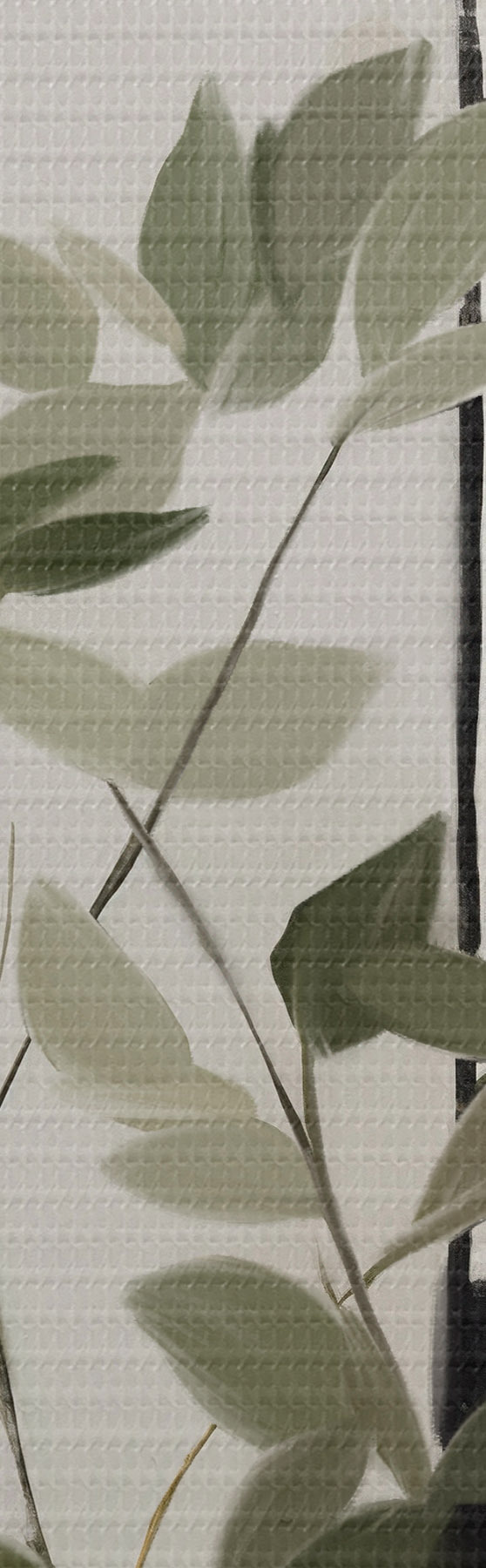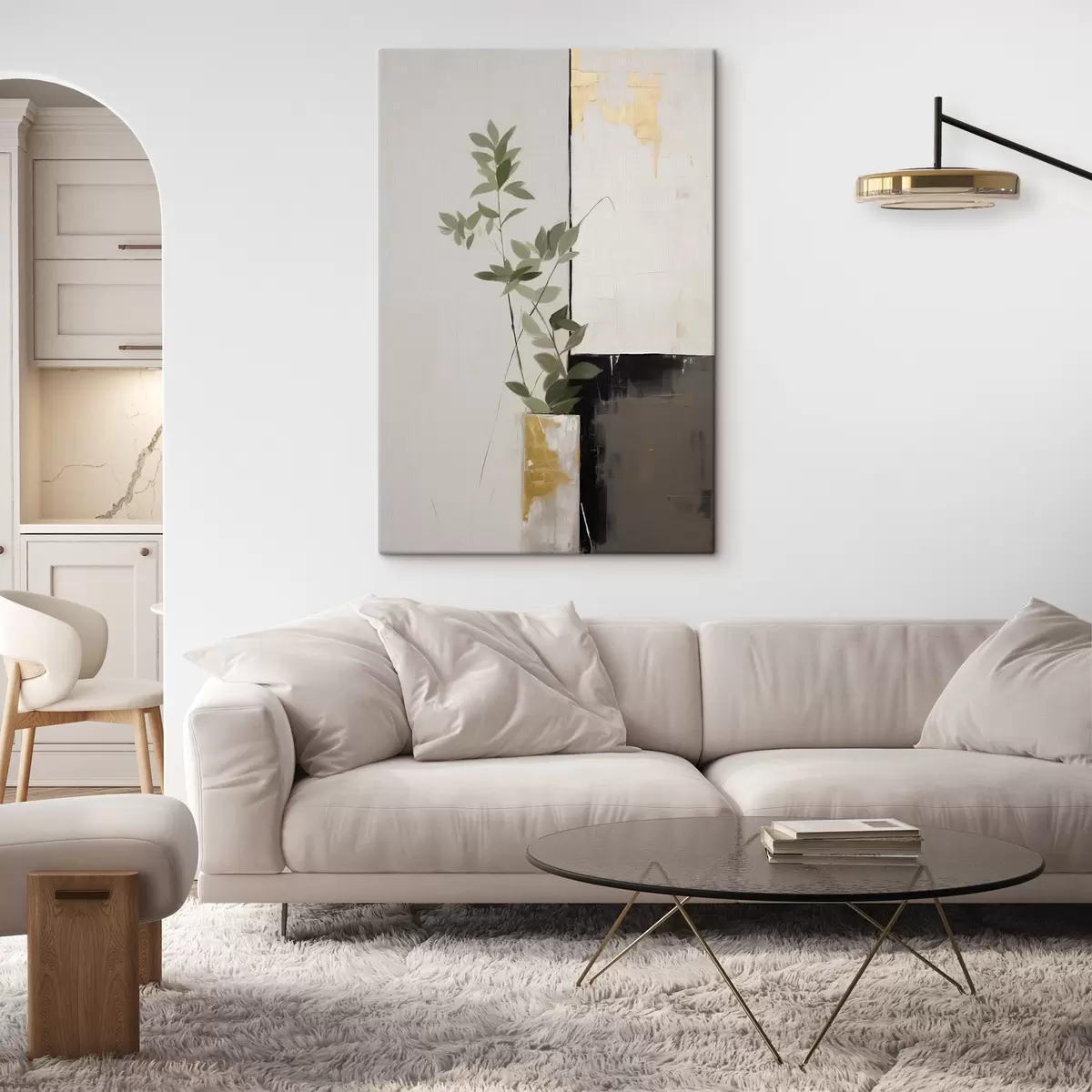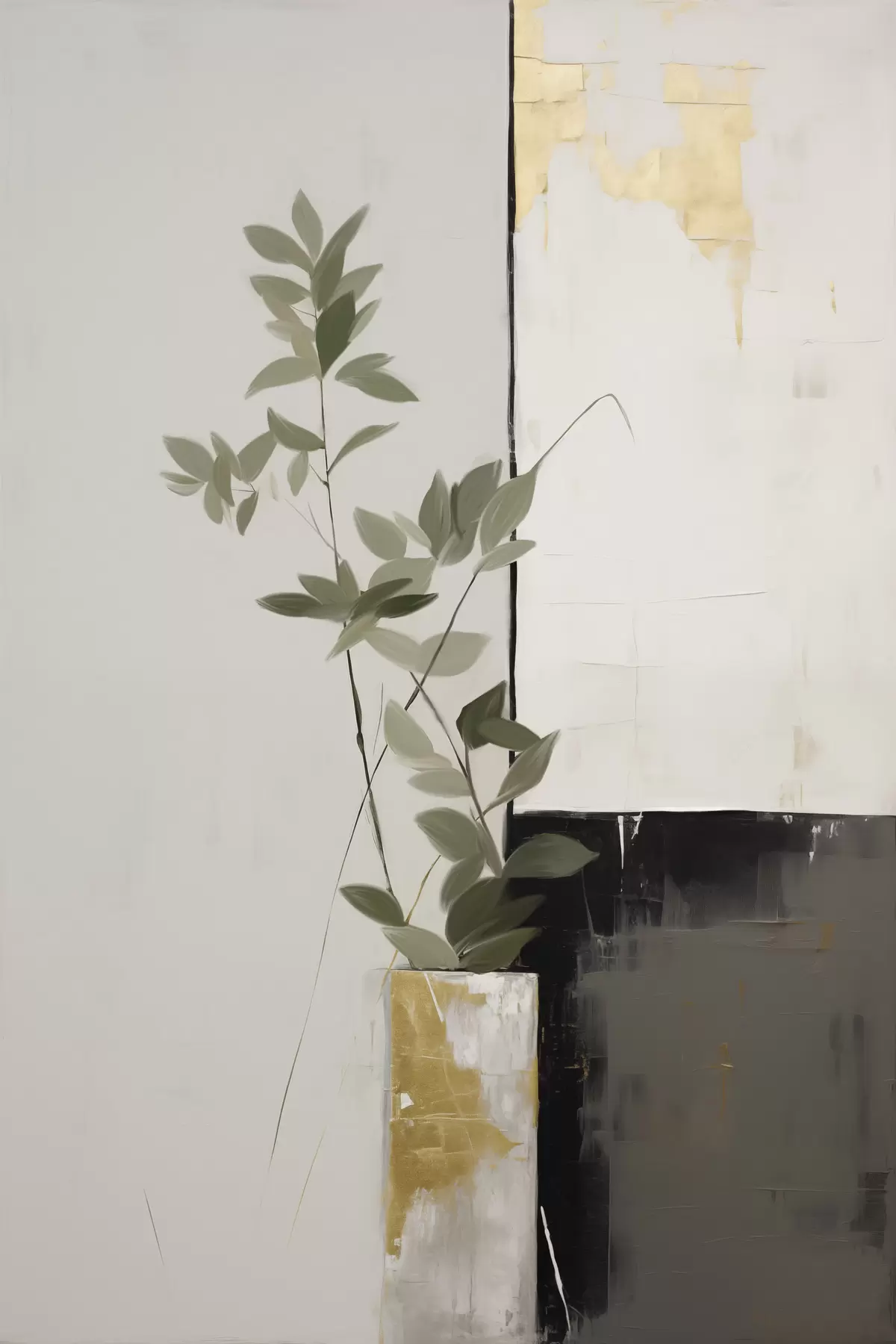 Obraz Minimalistická textúrovaná maľba vázy so zelenými listami na pozadí abstraktných geometrických tvarov Nr. s47036
