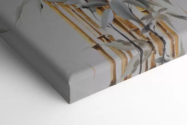 Obraz Abstraktné bambusové stonky so žltými akcentmi, jemnými bielymi kvetmi a bledo zelenými listami, sivé pozadie Nr. s47038
