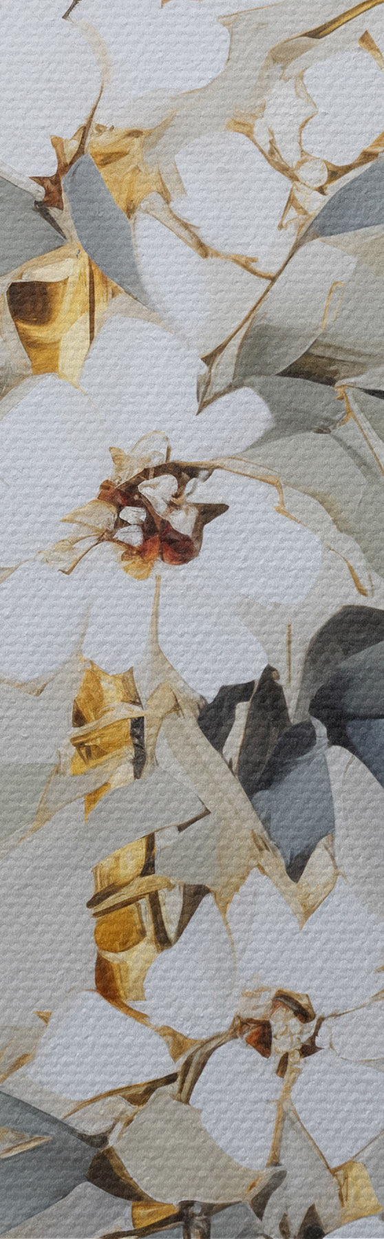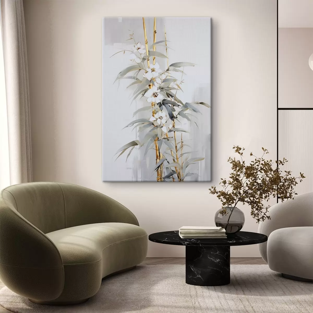 Obraz Abstraktné bambusové stonky so žltými akcentmi, jemnými bielymi kvetmi a bledo zelenými listami, sivé pozadie Nr. s47039