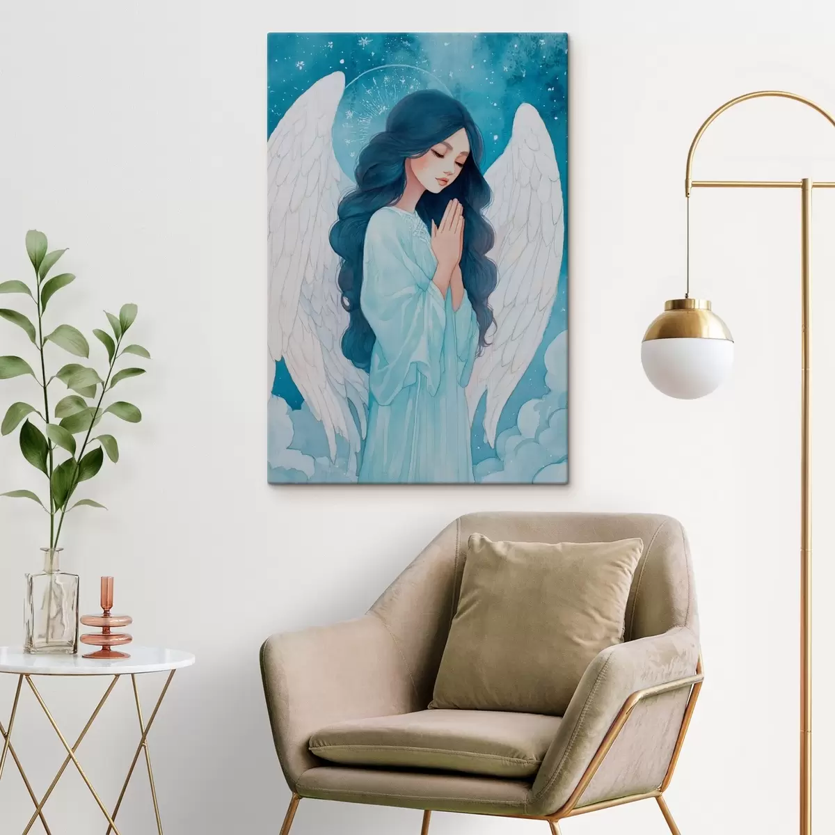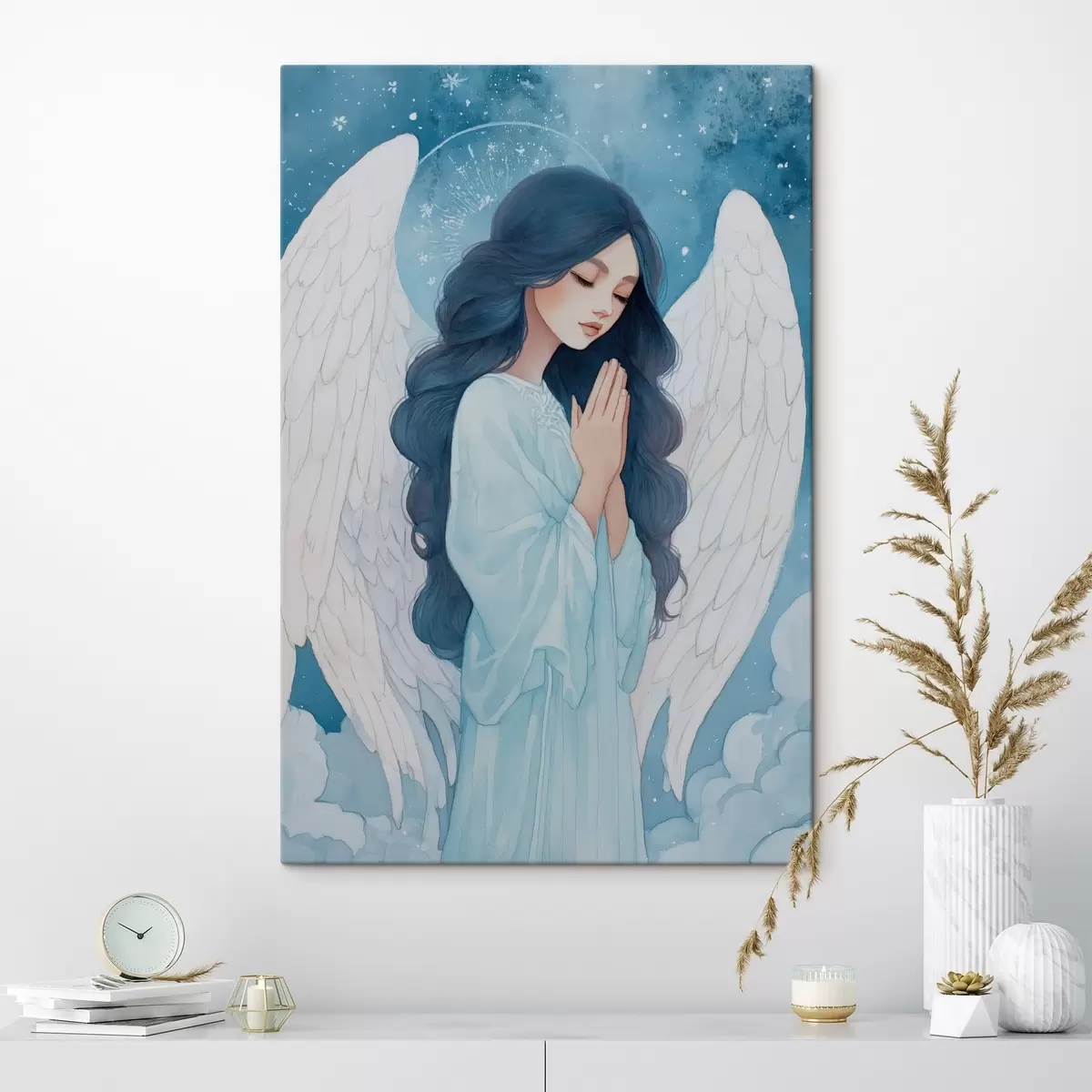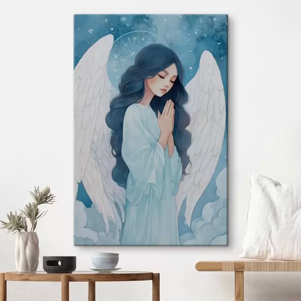 Obraz Očarujúca ilustrácia anjela medzi oblakmi v bielo-modrej farebnej palete Nr. s47095