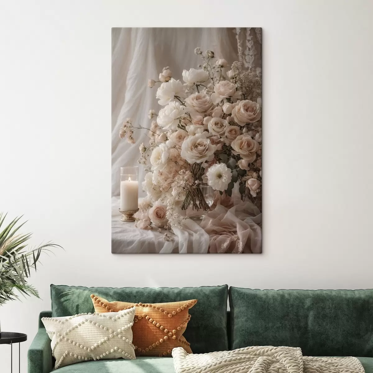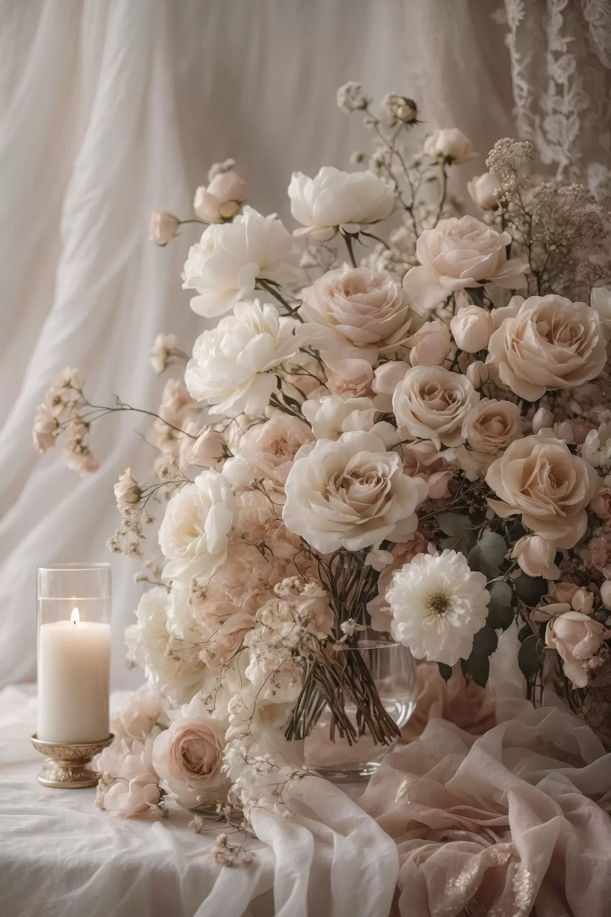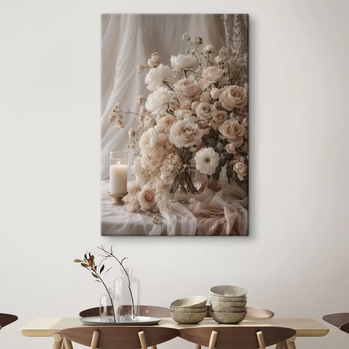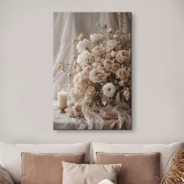 Obraz Krémové kvety vedľa zapálenej sviečky Nr. s47281
