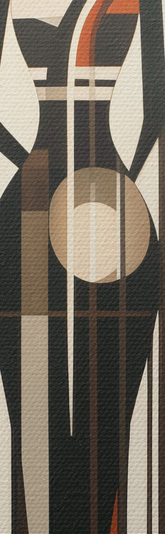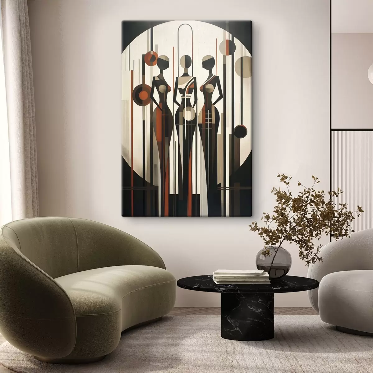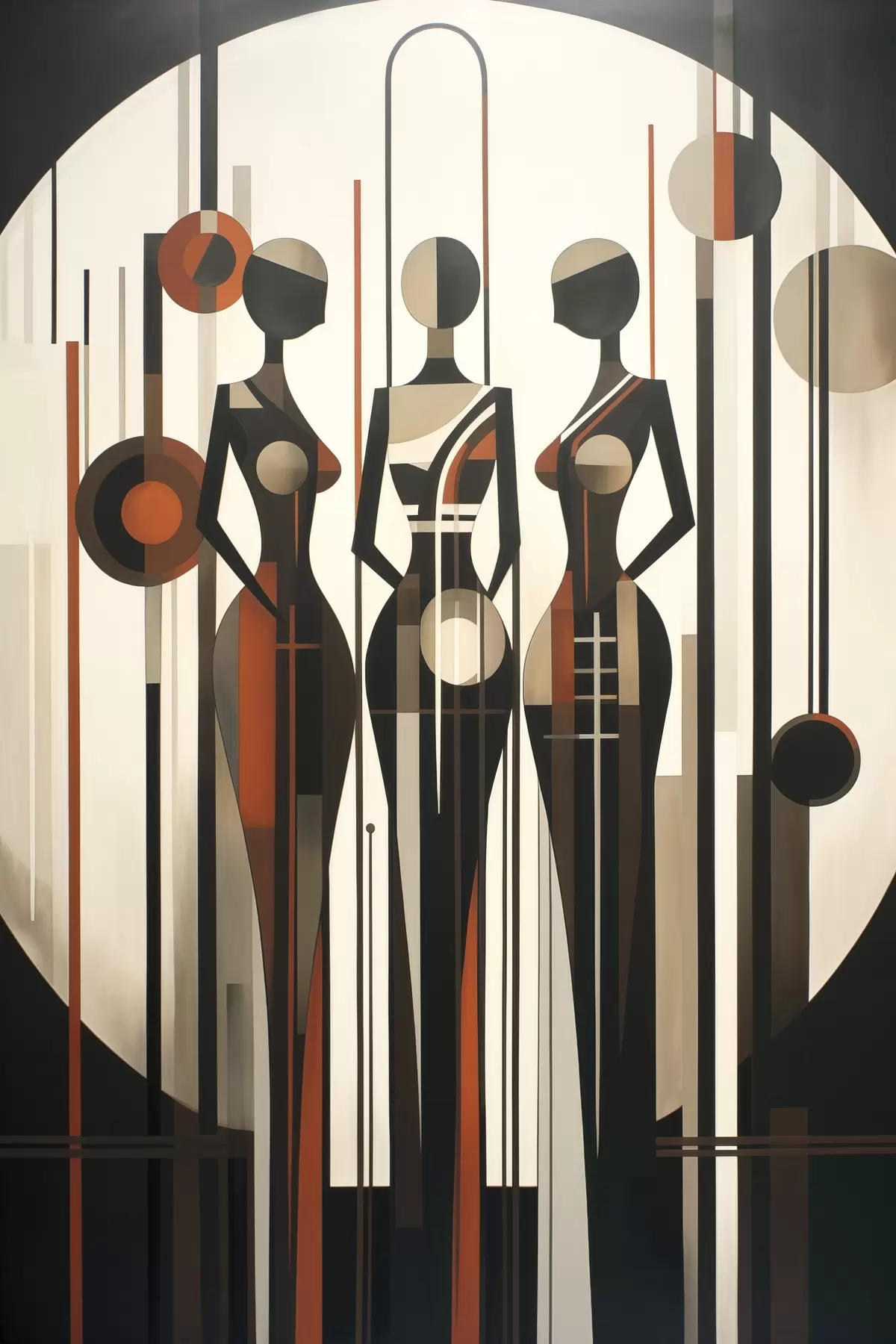 Obraz Štylizované ženské postavy s geometrickými prvkami na abstraktnom pozadí vertikálnych čiar a kruhov Nr. s47422