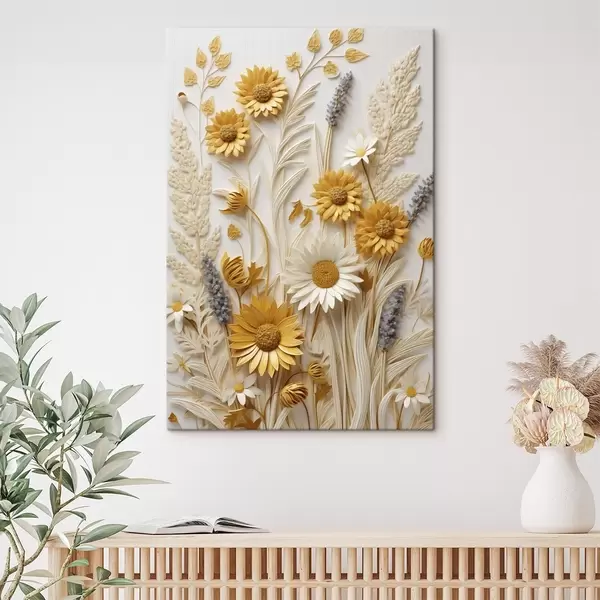 Obraz Textúrovaná kolekcia žltých a bielych sedmokrások so sušenými trávami a vetvičkami levandule na bielom pozadí Nr. s47430