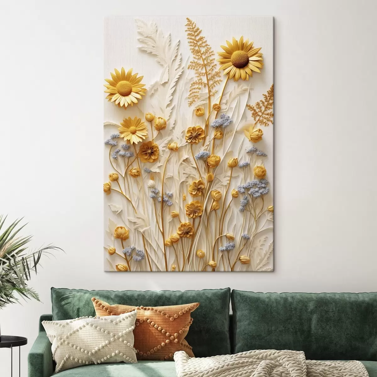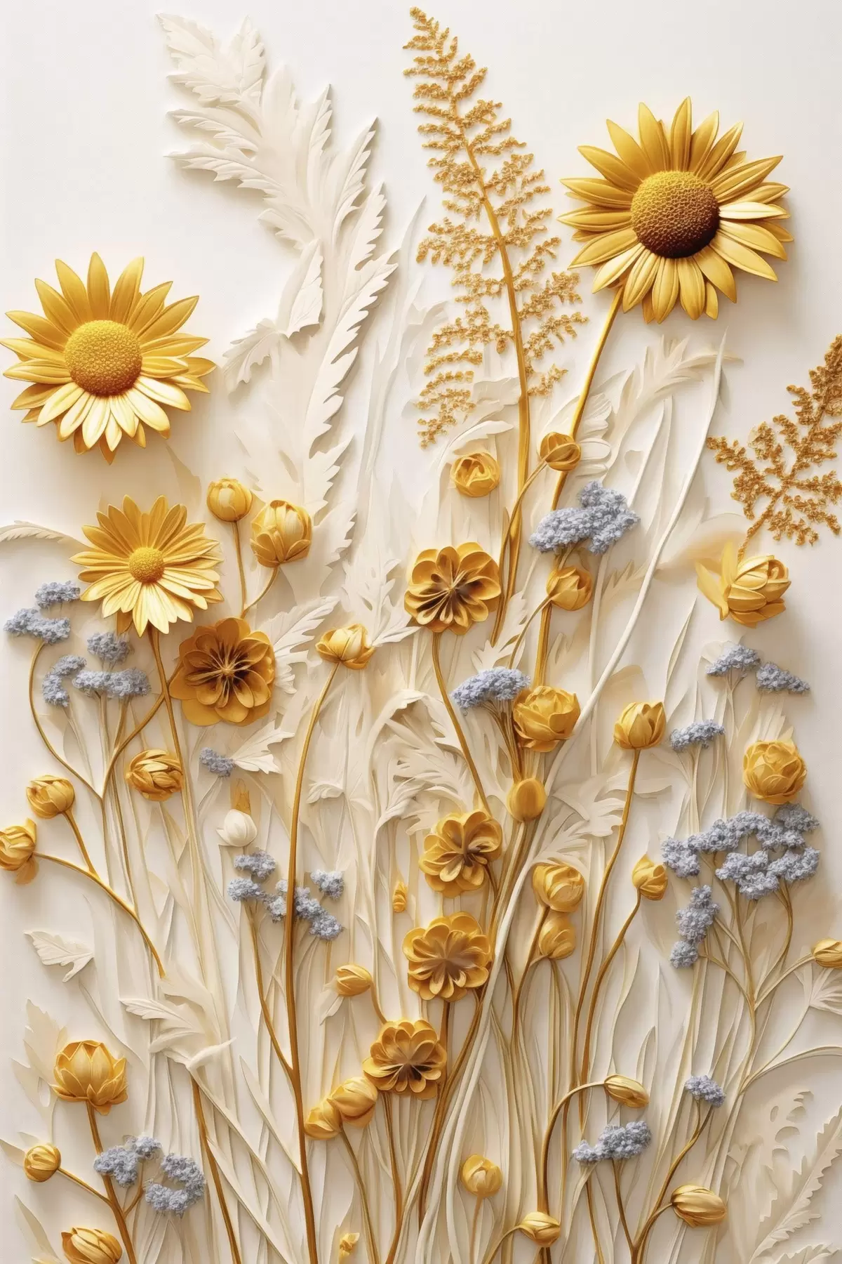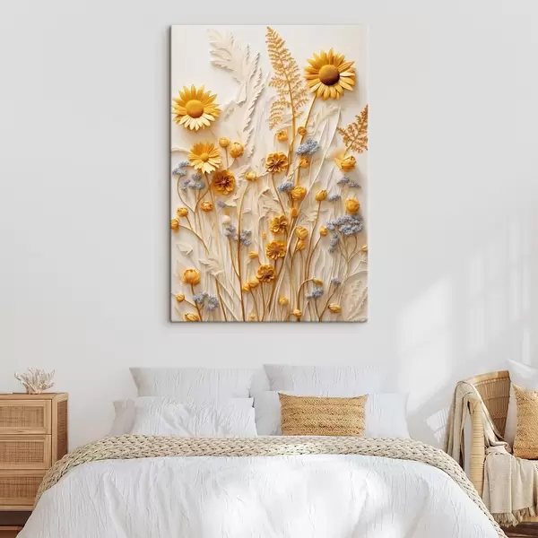 Obraz Textúrovaná kolekcia žltých a bielych sedmokrások so sušenými trávami a vetvičkami levandule na bielom pozadí Nr. s47431