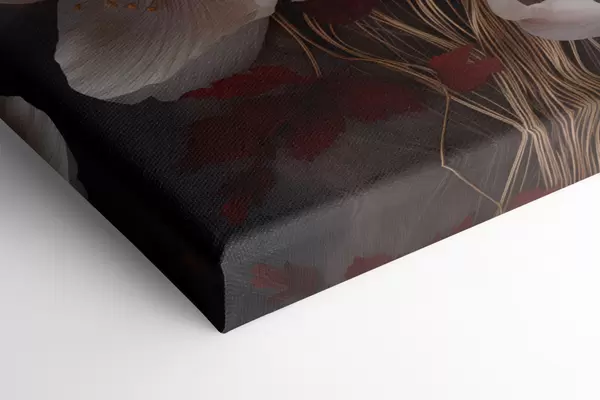 Obraz Jemné pivonky s tenkými, jemnými okvetnými lístkami, obklopené tmavočervenými listami na abstraktnom pozadí Nr. s47434