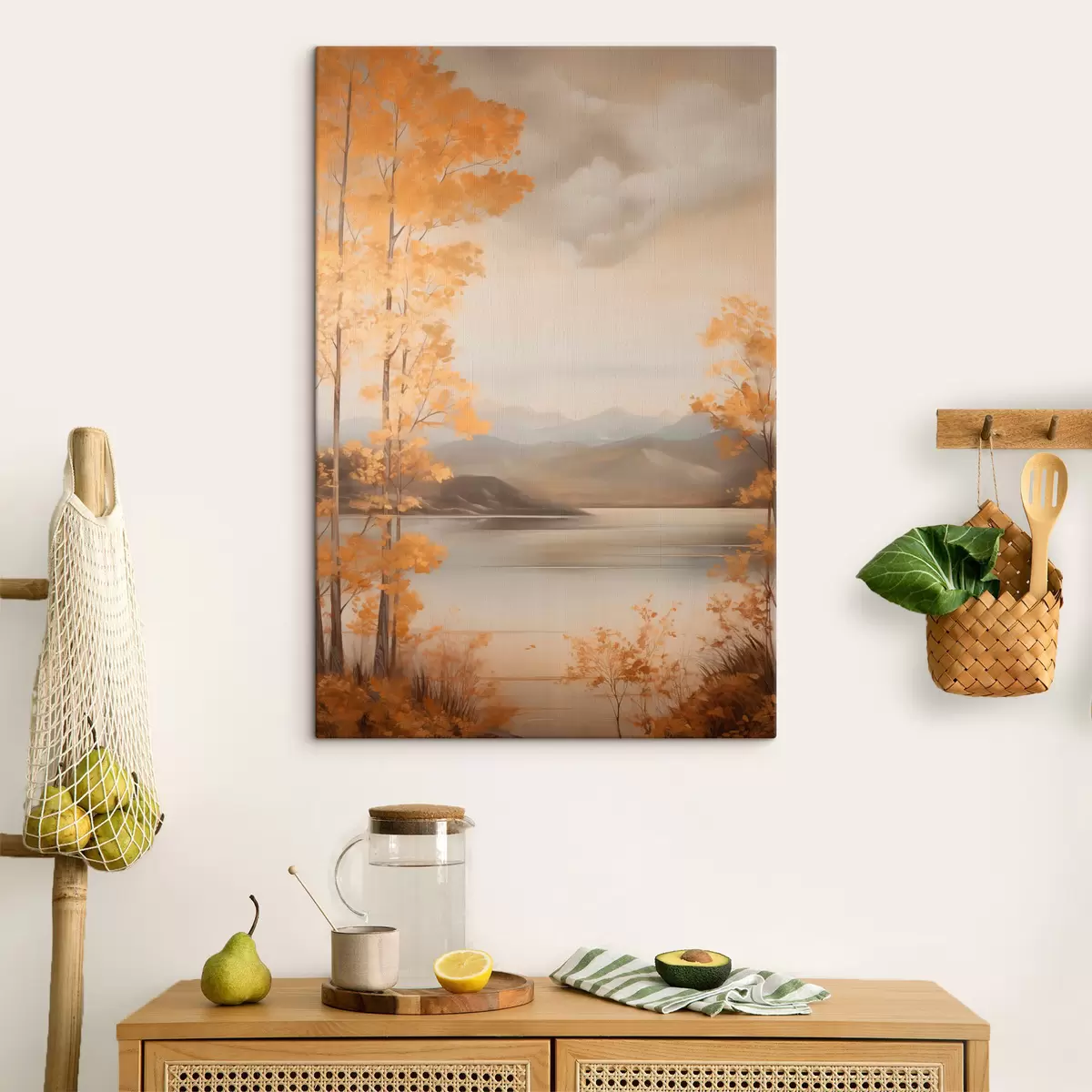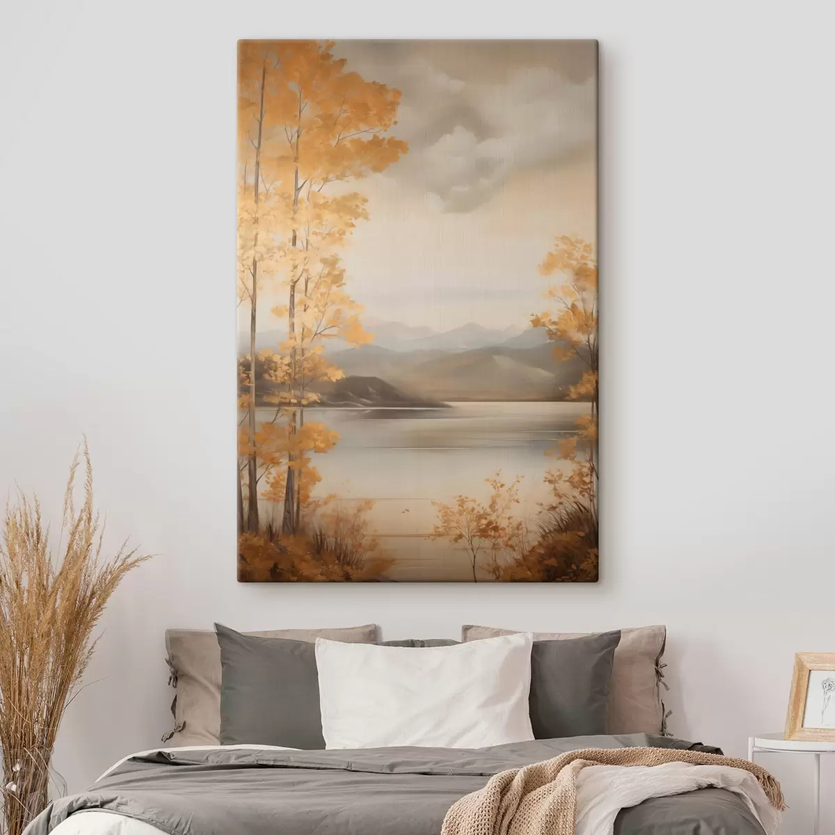Obraz Jesenné stromy s oranžovými listami rámujú pokojné jazero s diaľkovými horami pod zamračenou oblohou. Nr. s47441