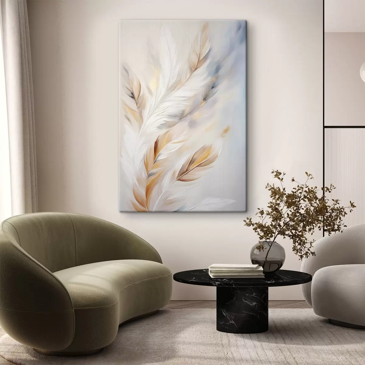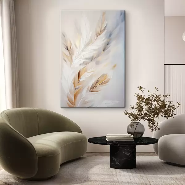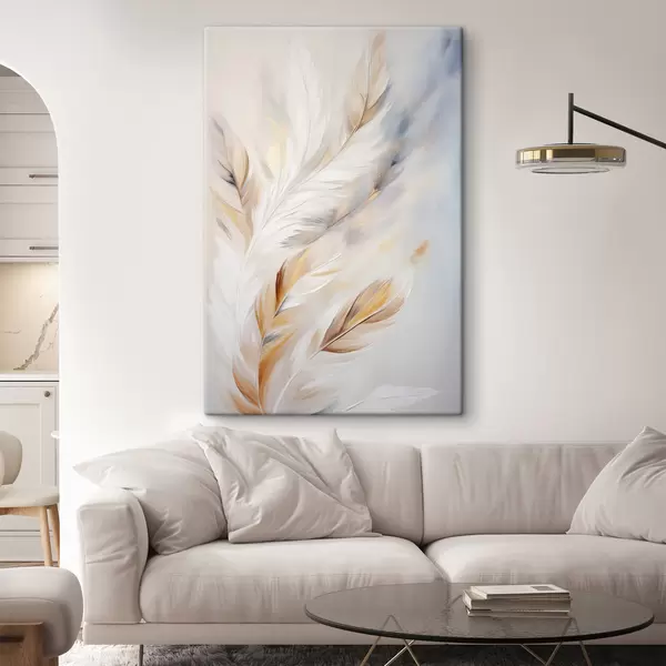 Obraz Veľké, mäkké perie s kombináciou bielych, žltých a hnedých odtieňov na svetlom, abstraktnom pozadí. Nr. s47443