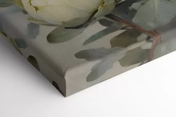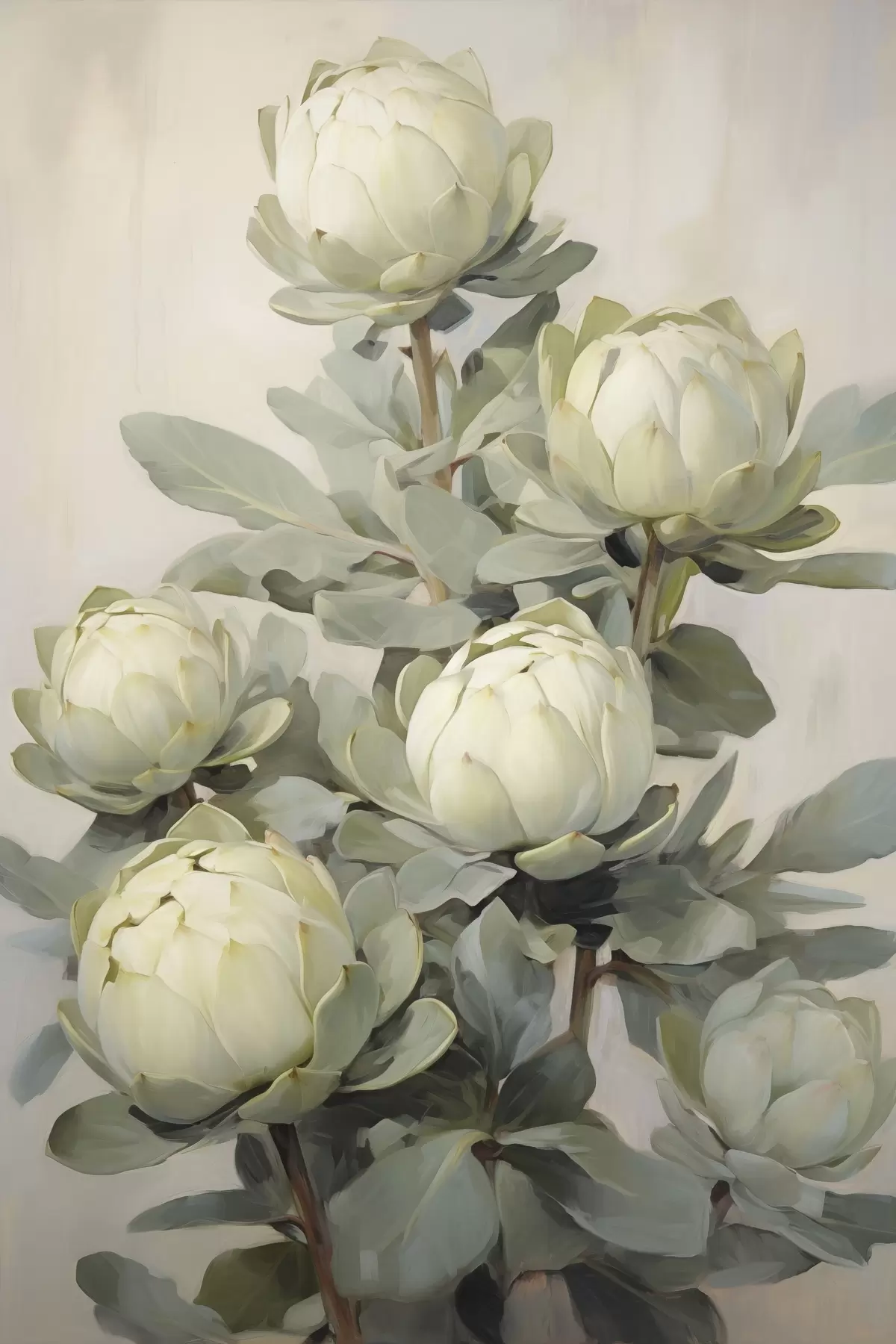 Obraz Maľba niekoľkých bielych kvetov protey s veľkými zelenými listami na svetlom pozadí Nr. s47861